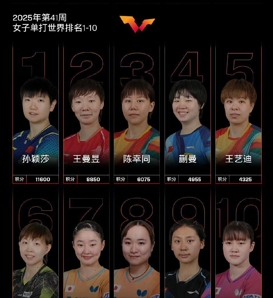朱雨玲升至第六,中国球员位列前六,国际乒联公布2025年第41周女单世界排名: 中国队球员孙颖莎、王曼昱、陈幸同、蒯曼、王艺迪位列前五,陈熠位列第九。 WTT中国大满贯女单四强申裕斌收获700个世排积分排名上升4个名次位列第13;八强朱雨玲收获375个世排积分排名上升1个名次位列第6;八强朱芊曦收获375个世排积分排名上升11个名次位列第24;三十二强朱思冰排名上升32个名次位列第68,刷新个人职业生涯排名新高。 其他中国队球员,石洵瑶排名第12,钱天一排名第18,何卓佳排名第25,覃予萱排名第38,王晓彤排名第45。 世界排名第1 孙颖莎 积分11600 中国大满贯赛事女单亚军,混双冠军,称霸女乒时间很久了,需要继续努力! 世界排名第2 王曼昱 积分8850 中国大满贯赛事女单冠军,收获2000点世界排名积分,14多万美元女单冠军奖金,还与蒯曼搭档获得女双冠军,是本站比赛女单、女双双冠王,最大赢家! 世界排名第3 陈幸同 积分6075 中国大满贯赛事女单四强,女双四强,女单半决赛再次不敌孙颖莎,缺乏夺冠的雄心壮志! 世界排名第4 蒯曼 积分4955 本次中国大满贯赛事女单16强被申裕斌轻松淘汰出局,外战外行又回来了,收输外战很难成为核心主力,女双与 王曼昱搭档夺冠! 世界排名第5 王艺迪 积分4325 中国大满贯赛事女单八强,不敌孙颖莎,但是本届赛事横扫日本削球名,桥本帆乃香打了一个翻申仗值得表扬! 世界排名第6 朱雨玲 积分3940 中国大满贯赛事 女单八强,老当益壮,积分升至第6保证了世界排名前六都是中国选手! 张本美和、伊藤美诚、陈熠、大藤沙月分列第7到第10位各自达成相应目标,陈熠被朱雨玲横扫需总结经验提升竞技水平!