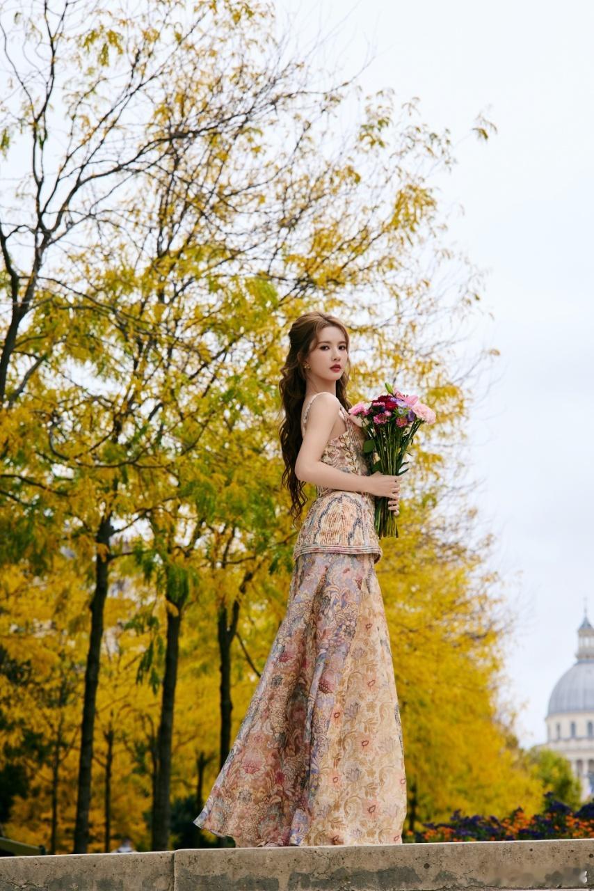 刘些宁秋日油画里走出的美人天呐!刘些宁在巴黎时装周这身打扮太绝啦,印花复古长裙在