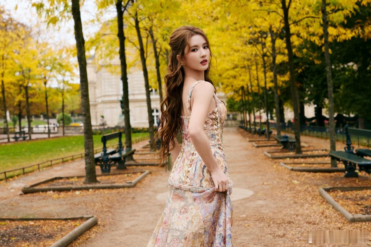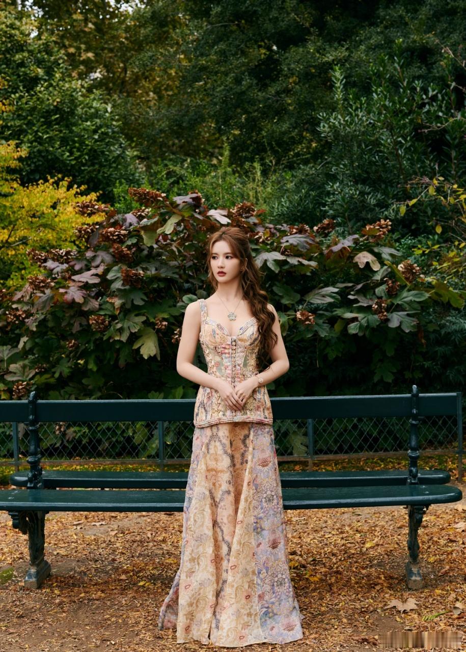 刘些宁秋日油画里走出的美人天呐!刘些宁在巴黎时装周这身打扮太绝啦,印花复古长裙在落叶间,往公园长椅一坐,仿佛从油画里走出的仙子,爱惨了!