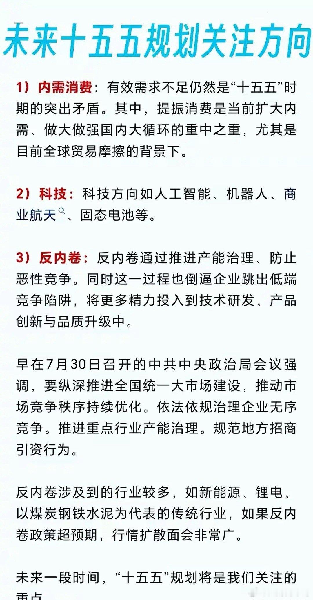 “十五五”规划值得关注的三大核心方向:一是内需消费,指出当前有效需求不足是突出矛盾,提振消费对于扩大内需、强化国内大循环至关重要,特别是在全球贸易摩擦加剧的背景下;二是科技发展,明确人工智能、机器人、商业航天、固态电池等为未来重点科技方向;三是反内卷,强调要通过推进产能治理、防止恶性竞争,倒逼企业加大技术研发与产品创新力度,提升品质,涉及新能源、锂电、煤炭钢铁水泥等众多行业。