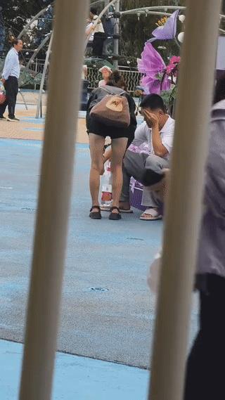 这名男子好像是受了什么委屈? 他捂着脸一直坐在那里不停的哭泣! 男子的女朋友则在