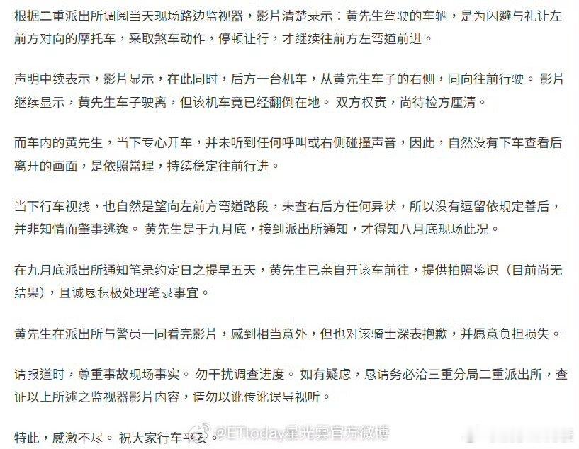 黄子佼方声明回应肇事逃逸 据台媒,黄子佼涉嫌肇事逃逸接受调查,随后透过律师发声明:“当下专心开车,并未听到任何呼叫或右侧碰撞声音,因此,自然没有下车查看后离开的画面,是依照常理,持续稳定往前行进”、“对该骑士深表抱歉,并愿意负担损失”。