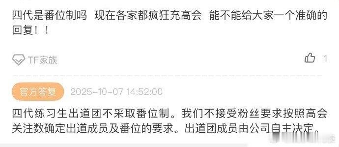 TF四代出道团成员由公司自主决定 时代峰峻正式回应:TF四代出道团将不采取番位制,最终出道成员名单完全由公司自主决定。