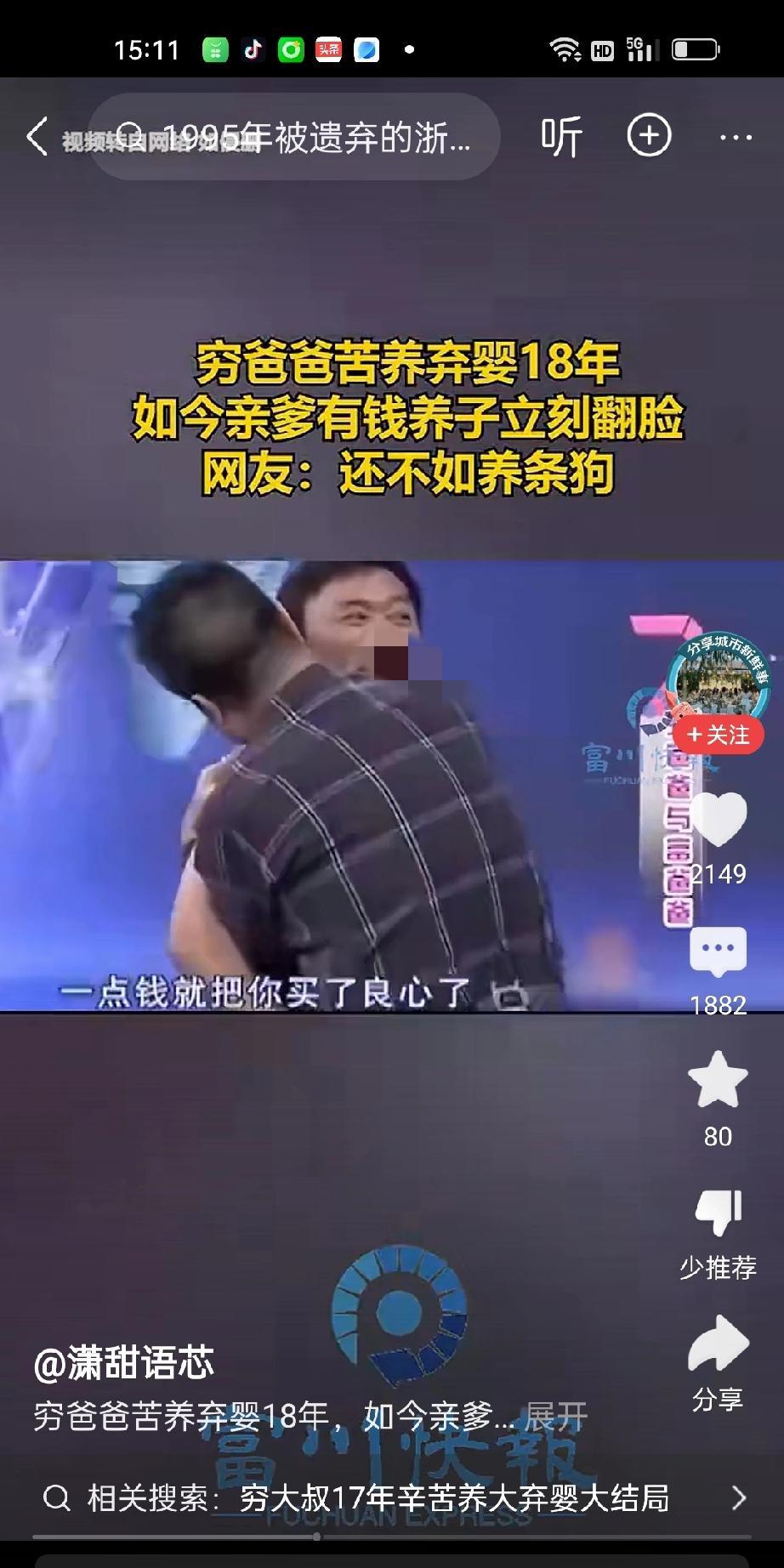 穷爸爸辛辛苦苦养弃婴18年。亲爸爸有钱了,找到这个弃婴。养子看到亲生父亲有钱,翻脸不认人,不给养父养老,还口口声声说自己想要一个更好的生活没错。养父被气的直骂他没良心。养子却无所谓,他说钱比良心更重要,亲父比养父更重要。悲哀啊,这就是喂不熟的狼。