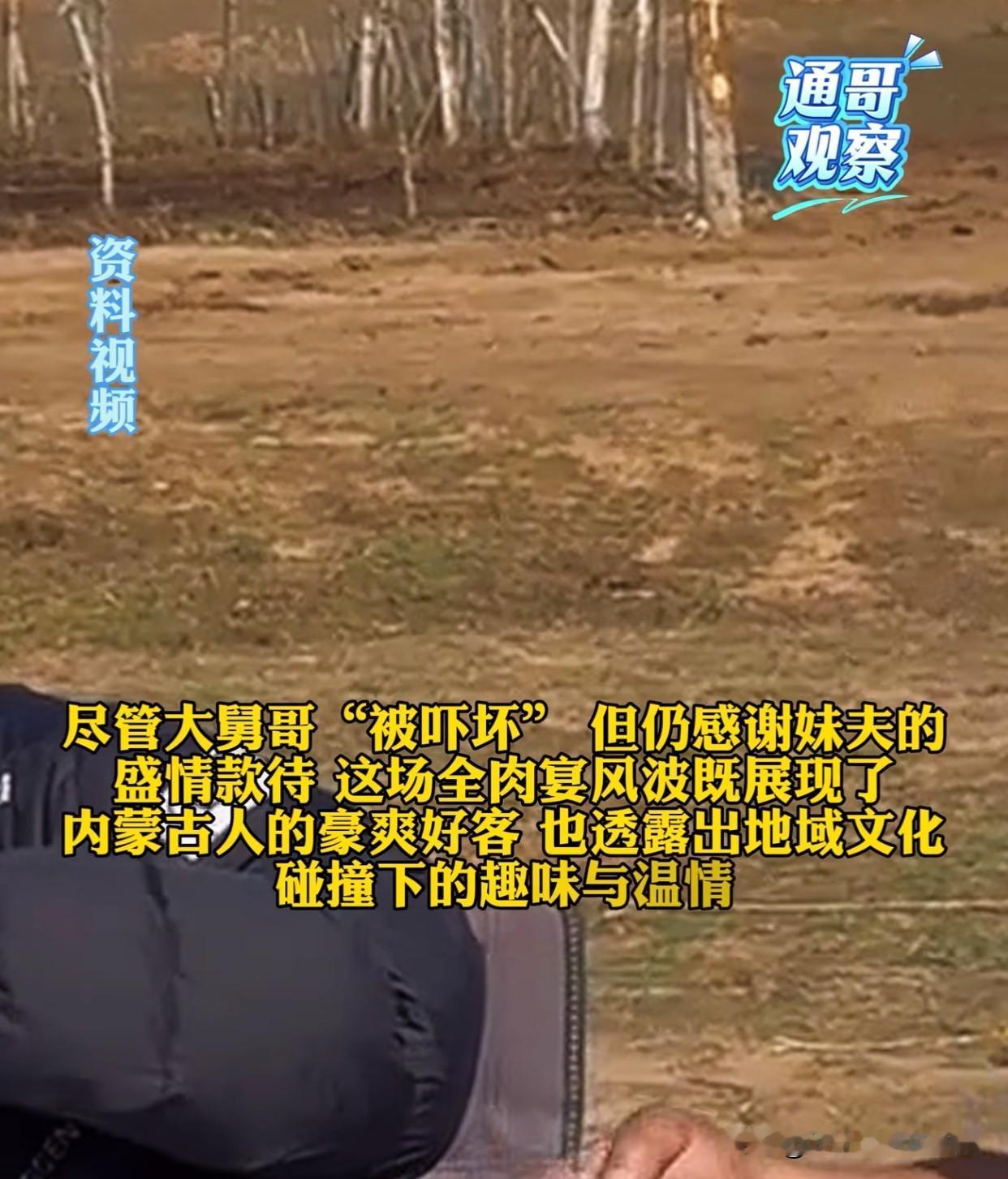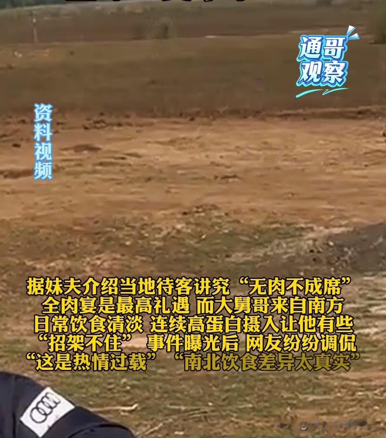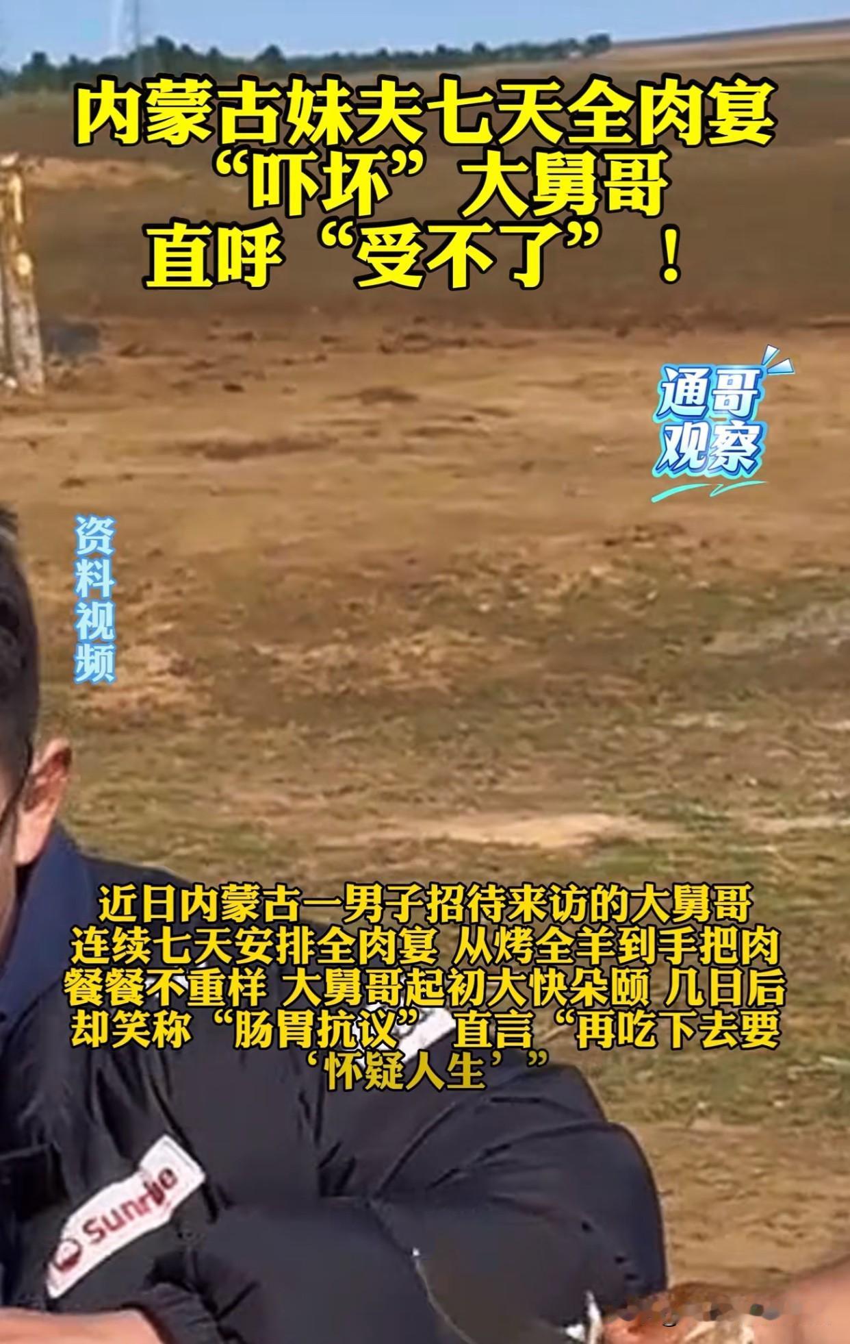 “怀疑人生了!”山西一女子嫁到内蒙古,哥哥去看她,本来想好好聊聊天,结果被连续七天的“全肉宴”给整怕了,妹夫天天准备大块手把肉,哥哥一看见肉端上来就赶紧护住碗,妹妹在旁边笑着说,哥哥还感冒着呢,实在吃不动了。这段视频挺火的,好多网友开玩笑说,这分明是娘家人来检查生活过得咋样。 要我说,内蒙古人待客是真实在,觉得最好的款待就是让客人吃肉。但山西人平时吃面食比较多,菜也喜欢带点酸咸口味,这么连着七天光吃肉,确实顶不住。不过说实话,妹夫这份心意特别真诚,他是真心想把最好的拿出来招待亲戚。 我觉得这事儿虽然好笑,但挺暖心的。两边的习惯不一样,可亲情是一样的。哥哥虽然吃得有点受罪,但肯定能感受到妹夫的实在。等以后回想起来,这绝对是一段让人笑着讲的回忆,用最直接的方式,表达了最真的感情。