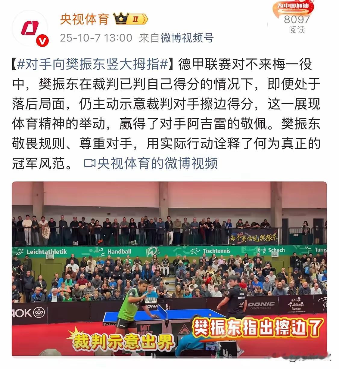 樊振东又被央视表扬了! 这还是东哥输球的状态下! 东哥和阿吉雷的比赛中, 对方擦边了, 裁判没有看到, 德甲也没有鹰眼, 只要东哥不说, 谁也没招! 但是东哥还是举手和裁判说明, 阿吉雷对比也懵了, 知道东哥举动后, 竖大拇指! 东哥已经放下包袱, 无惧输赢, 这才是他最难得的地方!