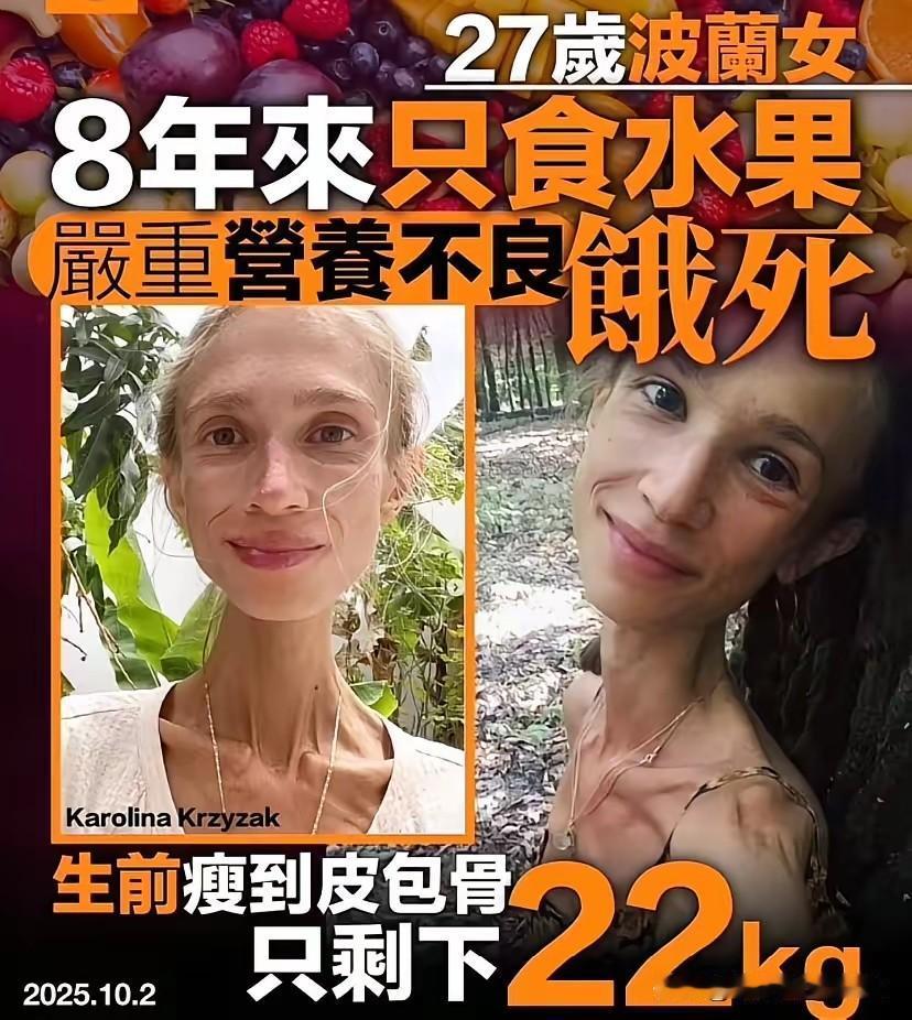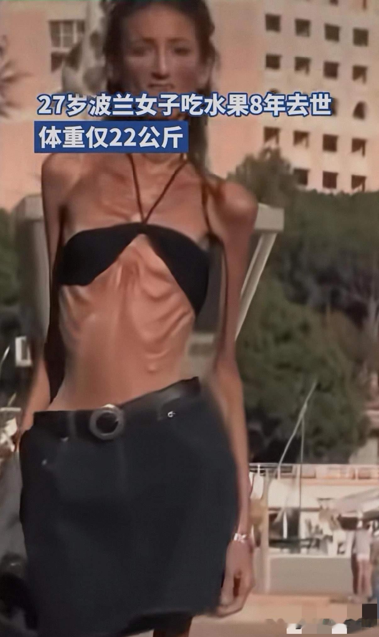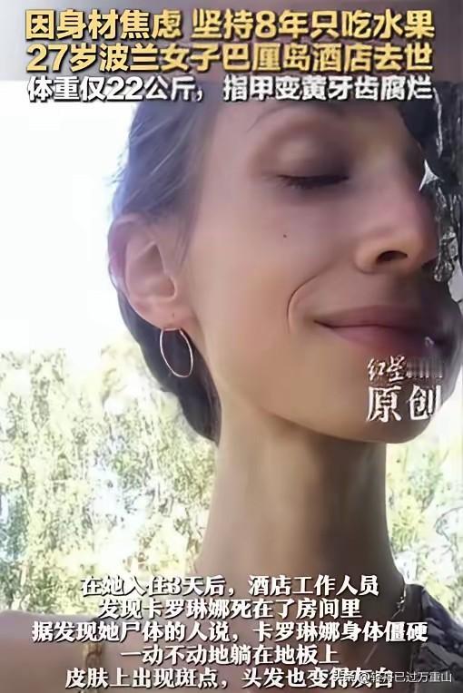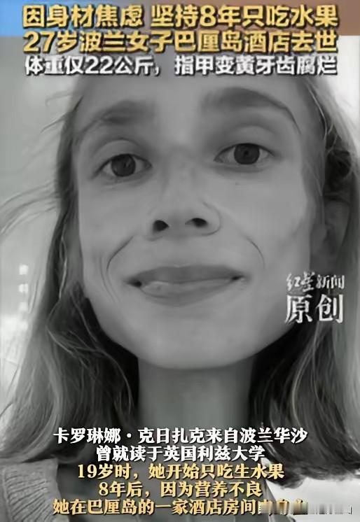 27岁波兰女子为了保持身材,竟然放弃吃饭,每天只吃水果,坚持整整8年时间,体重减到22公斤,全身都成皮包骨头,结果在巴厘岛旅游时,入住酒店3天后死亡,指甲变黄牙齿腐烂。家人坦言:她“被社交媒体洗脑了”! 她叫卡罗琳娜,是一位27岁的波兰女孩,她迷恋减肥,每天不吃饭只吃水果,冰箱里没有鸡蛋和肉类,全是芒果、香蕉、草莓,她把只吃水果当成健康生活,当听到有人说“你的锁骨能放硬币了,真漂亮”时,她虚荣心作祟,以为只要坚持下去就能保持自己想要的“完美身材”。 就这样,她从22岁开始吃水果,坚持了8年,到27岁时体重只有可怜的22公斤,一个成年人体重不及一个五六岁的孩子,皮包骨头瘦骨嶙峋,看着就像骷髅一样,看她的照片就觉得瘆人,肋骨全部露出来。 她去巴厘岛旅游时,永远留在了这里。因为8年来她只吃生水果,最终因营养不良在酒店房间里离世,她入住3天后,工作人员发现她死在酒店里面,据发现她的尸体的工作人员说,卡琳娜身体僵硬,一动不动地躺在地板上,皮肤上出现了斑点,头发也变得灰白。 看到这个新闻,我觉得太恐怖了,我也是微胖,天天喊着减肥,但是从来没有付诸行动,因为管不住嘴,但是我从来没有对自己的身材太过焦虑,她这照片太显老了,才27岁,我让我老公猜她几岁了,老公说七八十岁了,我说才27岁老公都不感相信。其实还是微胖好,微胖少点皱纹,不显老。减什么肥,好好活着才是最重要的。