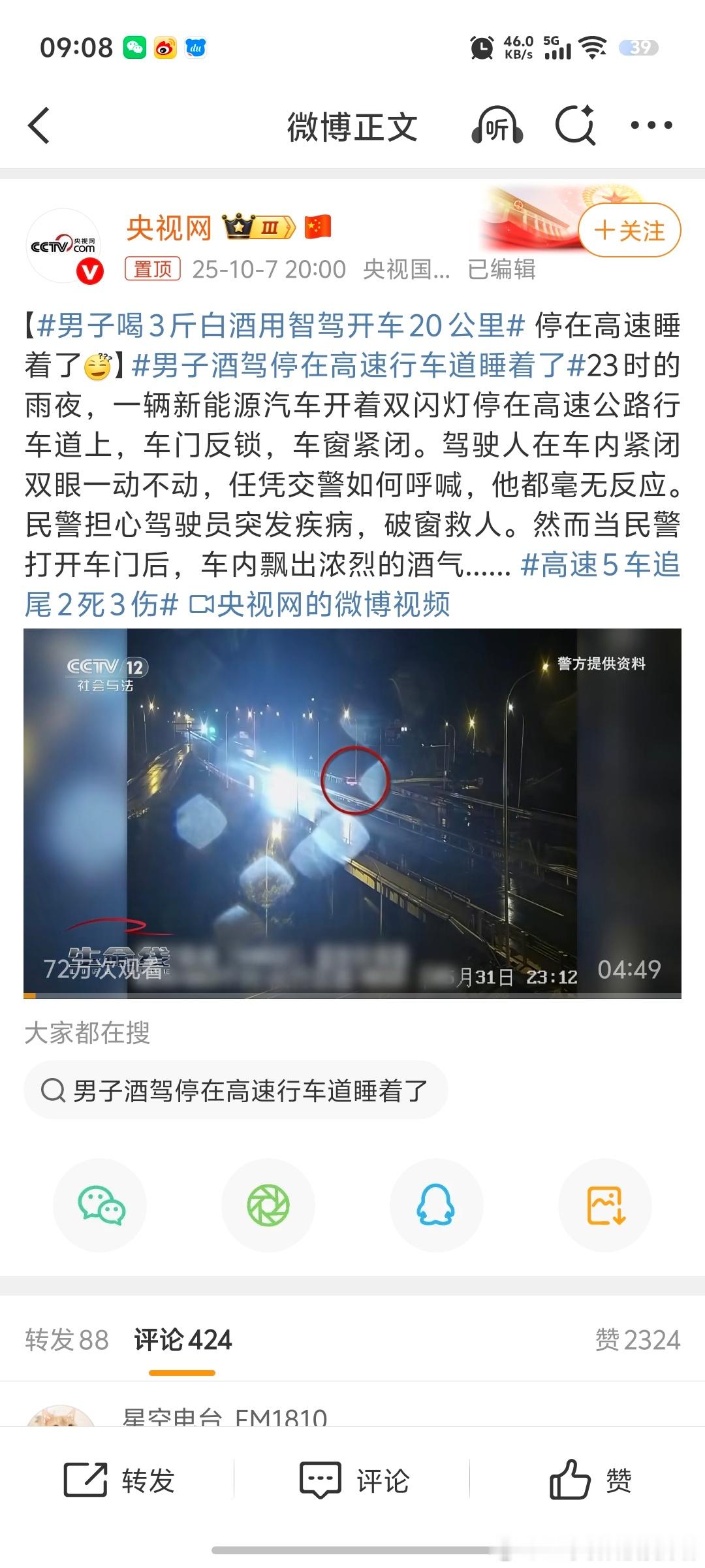 男子喝3斤白酒用智驾开车20公里有智能驾驶不是让你这么用的,现在的智驾都不兜底,也不是自动驾驶,出事了第一责任人还是司机。更何况这还是酒驾,这不仅是对自己不负责任,更是对他人的安全不负责任。酒驾开车就是不对。