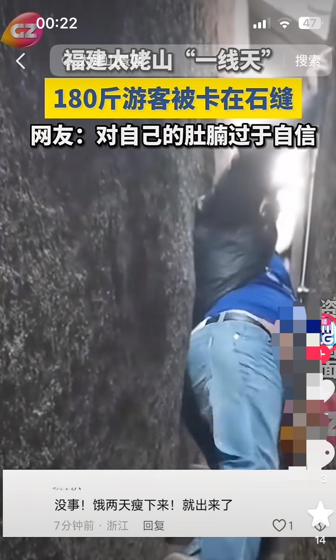"笑不活了!"福建太姥山景区近日发生的一幕让人哭笑不得,一名体重约180斤的游客在体验"一线天"景点时,竟被狭窄的石缝牢牢卡住,进退维谷。更尴尬的是,他身后等待通行的游客已经排起了长队,现场画面相当窘迫。 福建太姥山景区的 “一线天” 景点,最近因为一位游客的遭遇火了。监控画面里,一名男子卡在狭窄的石缝中间,上半身已经探过去,下半身却纹丝不动,脸涨得通红,身后排队的游客憋笑又不敢出声,现场气氛又尴尬又好笑。 这位游客姓王,今年 35 岁,平时在公司做行政工作,很少运动,体重一直维持在 180 斤左右。这次趁着周末和朋友来太姥山游玩,早就听说 “一线天” 是必打卡景点,哪怕朋友提醒过石缝最窄处只有 30 厘米左右,他还是觉得 “自己能过”—— 毕竟之前去其他景区走类似通道,虽然费劲但都顺利通过了。 当天上午 10 点多,景区游客已经不少,“一线天” 入口处排了 20 多个人。轮到王先生时,他深吸一口气,侧着身子慢慢往里挪。 刚开始的路段还比较宽敞,可越往里走石缝越窄,到中间位置时,他明显感觉腰部和肩膀被石壁紧紧夹住,每动一下都要费很大劲。他试着往前拱了拱,上半身顺利过去了,可臀部和大腿却被卡住,往前挪不动,往后退又怕失去平衡摔倒,整个人瞬间僵在原地。 身后的游客见状都停了下来,有人忍不住拿出手机记录,有人小声给王先生出主意,让他再吸口气收收肚子,还有人提醒他别着急,慢慢调整姿势。王先生额头上很快冒出了汗,双手紧紧撑着两侧石壁,脸贴在冰凉的石头上,能清晰听到自己的心跳声。他试着扭动身体,可石壁太硬,稍微用力就觉得肩膀疼,只能无奈地喊景区工作人员来帮忙。 景区巡逻的工作人员赶到后,先让后面的游客暂时改道其他路线,避免拥堵。随后拿来了肥皂水,小心翼翼地涂在王先生被卡的腰部和腿部,减少身体与石壁的摩擦力。两名工作人员一边指导王先生调整呼吸节奏,一边在两侧轻轻发力帮忙推拽。大概折腾了 15 分钟,伴随着王先生一声轻呼,终于从石缝里 “拔” 了出来。 出来后的王先生又尴尬又庆幸,揉着被夹红的肩膀连连说 “再也不逞强了”。他后来才知道,太姥山 “一线天” 因为地质构造特殊,每年都会有几起游客被卡的情况,景区在入口处也明确标注了 “建议体重 160 斤以下游客通行”,只是他当时光顾着兴奋,没仔细看提示。 这段视频被游客发到网上后,很快引发热议,有人调侃 “这是用身体测量石缝宽度”,也有人说没事,饿两天瘦了就出来了,也有人提醒大家游玩时要留意景区提示,别盲目尝试。 对此,你们怎么看?欢迎留言评论~