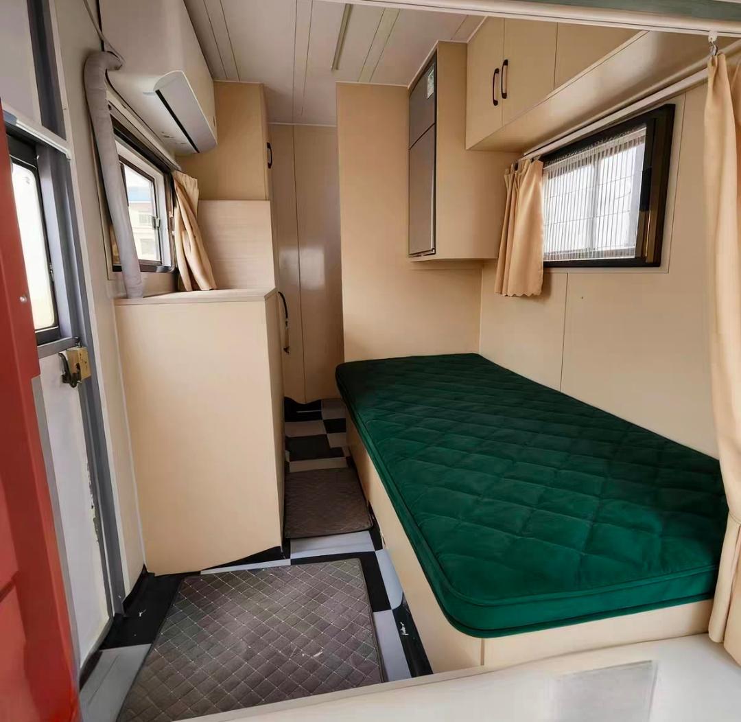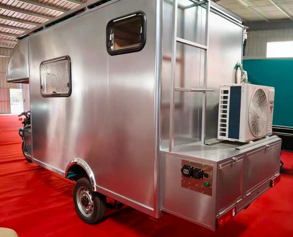 这台三轮房车的确很精致,外观和内饰都很靓丽,三蹦子露营车也在向中高端迈进。这是一辆电动三轮房车,大额头C型房车结构,封闭式驾驶室能够遮风挡雨,通身银色车漆,简洁靓丽上档次,箱体由铝合金打造,更轻更亮更个性;箱体两侧都开设了房窗,有利于室内通风和采光,箱门在右侧分别路边停车时上下车厢;右上配备了侧边帐,方便户外露营,车顶加装了太阳能板,有光就能发电;车尾下面还有增程器,有油就能边跑边发电,提供电力上的第三道保障;室内左侧是纵向单人床,上部有吊柜和车载冰箱,右侧是靠窗厨柜,上面可作为吧台使用,窗户上方还有驻车空调,不惧冬冷夏热;车尾是洗手间,解决了长途自驾游如厕和洗浴问题。三轮房车不止是经济实用,也可以做的高端大气上档次,一台不算贵的电动三轮房车就是一座移动的精致温暖小家。三轮房车 电动房车