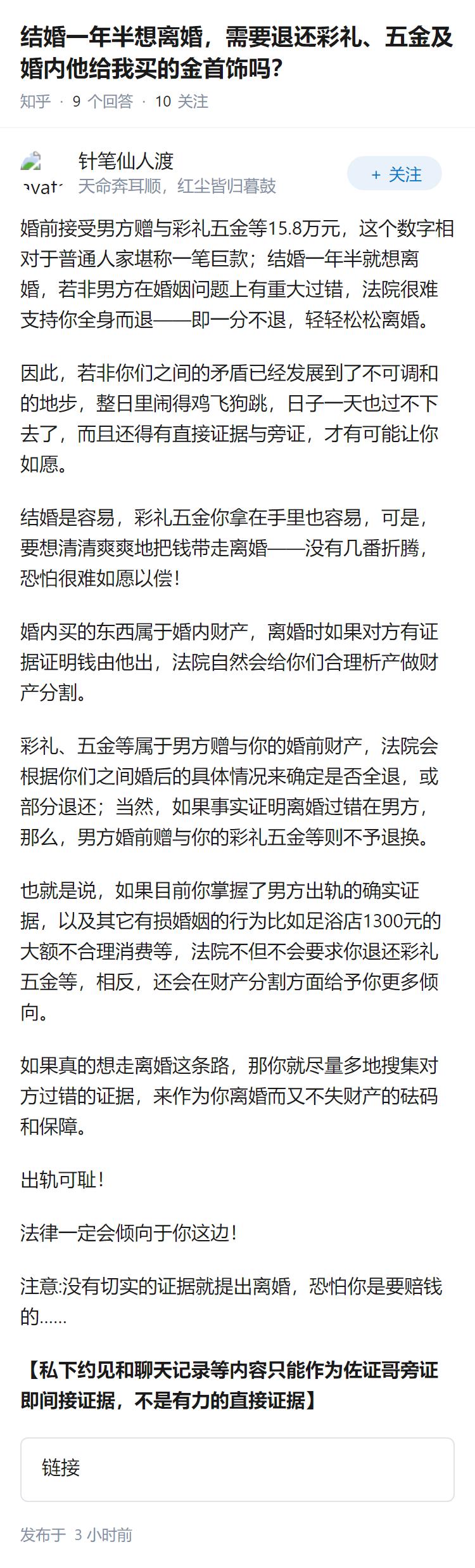 结婚一年半想离婚,需要退还彩礼、五金及婚内他给我买的金首饰吗?