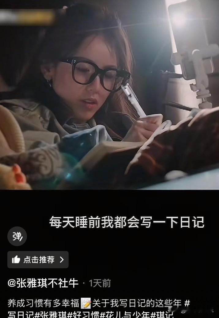 在如今这个手机刷视频、看电子书的时代,谁还会想起写日记呢?而她偏偏做到了。 最近《花儿与少年》第七季正在热播,观众对这部综艺的反响特别好,里面有一个年纪最小的女孩,名字叫张雅琪,她从一个路人,变成了很多网友喜欢的人,不是虚的,是她真的很优秀。 她是参加综艺《令人心动的offer》走进公众视野,在节目中是一名律师,参加完这档节目,成为了一家公司的法务,因为觉得自己不适合干这个工作,辞职去湖南卫视当实习生,然后又被选中参加花少,你以为这一切都是因为她幸运吗?其实并不是,这一切都源自于她的努力,从花少中的一个细节就可以看出,她是一个很自律的女孩。 在节目中她会在晚上大家都休息了之后,一个人在客厅写日记,对,你没听错就是写日记,这年头能写日记的人真的寥寥无几。 网友通过节目看到她写日记,都在询问她这件事,于是她专门录了一期视频,分享了她写日记这个习惯。 她写日记是从初一开始,这个习惯一直坚持到现在。在初一时,她向班上一位文笔很好的同学请教:怎样才能提升写作能力? 这位同学告诉她: “你就从先写日记开始,哪怕每天你只写一句话都行。” 于是她开始了自己的写作生涯,从刚开始的一句话,到后来的越写越多,每一天把脑袋里所有的想说的话,都倾泻出去,写着写着脑袋里还会出现一些新的想法,让自己静下来,倾听自己内心的感受,想清楚自己的干的事情,还有内心自己真实的想法。 尤其是自己感到焦虑、迷茫、烦躁的时候,写日记会让自己变得平静,释放压力,享受这个过程,每天都鼓励自己,自己能做到很多事情。 写日记的魅力在于,你可以看到很多年前的自己,你可以看到当时的自己,遇到过很多困难的事情,但都把他一个一个解决了,那个越来越好的自己,然后与自己和解。 她分享的这件事,真的是受很多人的喜爱,看完她的视频大家都想写日记,但不知道会不会有人坚持超过三天呢? 花儿与少年 花儿与少年7 张雅琪