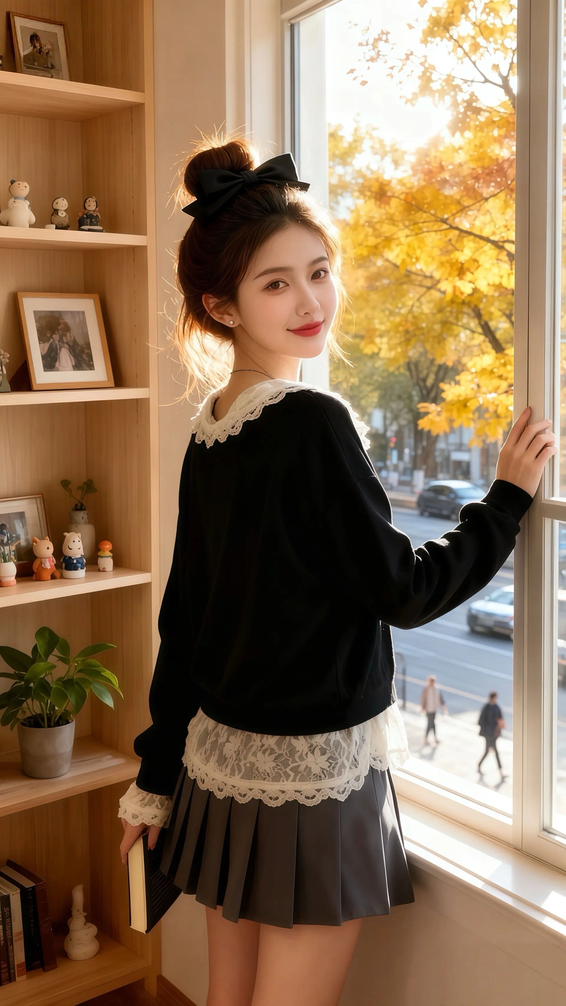 秋阳与蕾丝的心动 秋日的阳光漫过女装店的弧形窗,许妍指尖搭在窗沿,蕾丝袖口随动作轻轻晃了晃。皓明望着她的背影,黑色上衣与白色蕾丝的层次在光里格外柔和。 “今天这身,很衬你。”皓明走上前,目光落在她领口的蕾丝花纹上,“黑白的搭配很雅致,尤其是蕾丝的细节,让整体多了份温柔。” 许妍转过身,百褶裙微微摆动。“这家店的风格很对味,你看这裙子的版型,和蕾丝内搭配在一起,很协调。”她走到黑色柜子旁,紫色蝴蝶兰的花瓣映着她的衣角,“连店里的布置都和衣服很搭呢。” 皓明从身后轻轻环住她,下巴抵在她发顶:“衣服好看,穿的人更出彩。你穿上这身,每一处设计都像是为你量身定做的,很有灵气。” 窗外街道黄叶纷飞,室内暖光里,许妍看着镜中两人的身影,听着他真诚的夸赞,心底的甜意比蕾丝的纹理还要细腻。原来一件合心意的穿搭能带来愉悦,而爱人的欣赏,让这份愉悦有了更动人的色彩。
