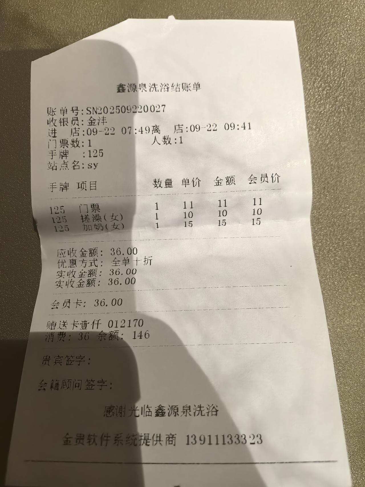 国庆长假结束了,今天老公上班,我休息,出去洗澡花费36元。 不是花自己的钱,不用心疼。这洗澡的金卡是我表哥大成送我的。 去年帮他办事,他送了我一张洗浴金卡。我和老公不识货,就随手扔一边去了。 “看你表哥也真是,去高档浴池人家就送一张卡”老公不以为然。 我觉得纳闷,但是也不好意思问那些去高档浴池的人。 终于忍不住好奇心,老公打了洗浴中心电话,原来所谓单位金卡里面有1000元。 当时我们两个懵了,老公连忙问,可以退钱么? 服务员说,退不了。 想想也是那么回事。 于是去年我就去了高档浴池洗澡,服务项目挺多的。洗一次门票。11元,搓澡10元。我加了牛奶15元。 消费36元。依照我老公的话说,表哥送我的卡也是别人送他的,我不用领情。随便消费。 呵呵,可是我这个人不会享福。用了一年1000元也没有用完。 关键是这家洗浴中心离我家也远,走路十几分钟。 小洗浴中心,洗一次10元,如果搓澡8元,如果选择充值300元的,洗一次好像还能便宜一些。算算一年去洗澡大概600-800元左右。因为家里也可以洗澡,一般夏天天天家里洗,可是天气凉了还是愿意出去洗澡,有人搓澡,有人唠嗑的多好啊?国庆节洗浴 友友们你们出去洗澡,一次花多少钱啊?一年大概费用呢?欢迎你在评论区聊聊。 洗澡这点事