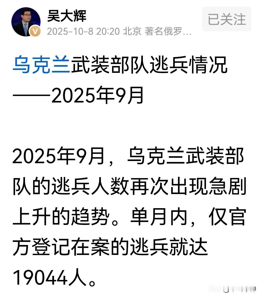 昨天晚上,著名俄罗斯问题专家吴大辉发文,说明了今年乌克兰武装部队的逃兵情况,他提供了三个数据:一是今年9月单月内,仅官方登记在案的逃兵就达19044人。二是2025年至今累计逃兵人数为161755人。三是自俄乌全面开战以来,总逃兵人数达284887人。透过这三组数据我们可以发现三个问题:第一,难怪乌军兵源紧张,新招的兵今年抓来的不如逃跑的多。第二,今年逃跑的人数急局上升,到目前为止今年累计逃兵人数为161755人,占近三年多乌军逃跑人数的约57%。第三,说明今年以来俄军攻势太猛,对乌军产生震慑作用,为保命三十六计跑为上策。冬季来了,俄乌战场上乌军度日如年,更艰难的日子到来了。面对攻势凌厉的俄军,乌军兵力捉襟见肘,如何防止士兵开小差,是乌克兰急需解放的一个问题。