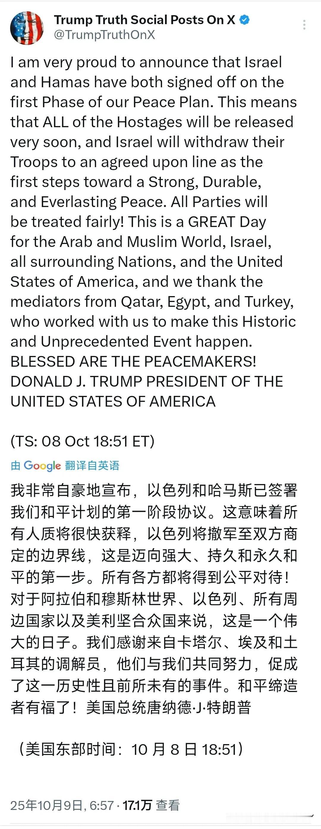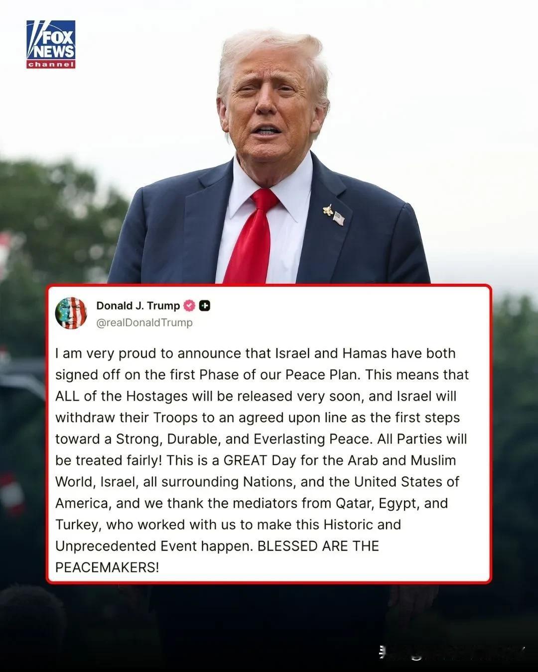 特朗普10月9日激动地写道:“我非常自豪地宣布,以色列和哈马斯已签署我们和平计划的第一阶段协议。这意味着所有人质将很快获释,以色列将撤军至双方商定的边界线,这是迈向强大、持久和永久和平的第一步。 明眼人都看得出,特朗普这又是在为自己心心念念的诺贝尔和平奖造势。可问题来了,若这份协议真能被切实遵守,特朗普就配得上诺奖吗?答案恐怕没那么简单。 先看这份协议的达成过程,特朗普在声明里感谢了卡塔尔、埃及和土耳其的调解员,却刻意弱化了这些国家的核心作用。10月8日在埃及的停火谈判中,埃及情报总局局长拉沙德、卡塔尔首相穆罕默德、土耳其国家情报局局长卡林都亲自到场。 正是他们分别撬动哈马斯与以色列的沟通渠道,才啃下了最硬的骨头。美国这边,出面的主要是中东问题特使和特朗普的女婿库什纳,特朗普本人并未深度参与一线斡旋,如今却急于站到台前领功,这吃相未免太过着急。 再看协议本身,不过是“第一阶段”而已。人质获释、以军撤军,这些都是停火的基础步骤,远非“持久和永久和平”的全貌。巴以冲突绵延数十载,宗教矛盾、领土争端、难民问题如同缠绕的乱麻,哪是一份阶段性协议就能彻底解开的? 就像盖房子刚打了地基,连墙体都没起来,怎能就吹嘘建成了摩天大楼?诺奖委员会向来看重长期且实质性的和平贡献,当年昂山素季获奖,是因其数十年为缅甸民主与和平的坚守。 安南获奖,源于他在联合国推动多边和平行动的持续努力。特朗普这刚迈出第一步就急于邀功,未免把诺奖看得太廉价。更值得玩味的是特朗普对和平的“功利化解读”。 他对诺奖的执念早已是公开的秘密,此前就曾多次向相关人士旁敲侧击,甚至让白宫造势拉拢支持提名的国家。这次协议刚签署,他就立刻宣布可能于本周末(11日或12日)赴中东,算盘打得再清楚不过。 就是想趁着热度刷足“和平推手”的存在感,把地区和平当成自己的“政治勋章”。这种把和平当作获奖工具的心态,与诺奖倡导的纯粹和平精神背道而驰。 哈马斯的声明其实也透露出隐忧,他们特意呼吁特朗普及担保国确保以色列执行协议,这说明协议的落地还充满变数。过往经验早已证明,巴以之间的协议不乏“纸面和平”,前几年签署的停火协议多次因零星冲突破裂。 若这份第一阶段协议后续执行遇阻,甚至重陷僵局,特朗普此刻的“功绩宣传”岂不成了笑话?诺奖从不颁发给“可能的和平”,只认可“已实现的安宁”,仅凭一份尚待检验的阶段性协议就谈获奖,未免太过草率。 退一步讲,即便协议顺利落实,功劳也该归于多方合力。卡塔尔、土耳其凭借与哈马斯的特殊关系穿针引线,埃及作为传统斡旋方搭建谈判平台,这些都是促成协议的关键力量。 特朗普政府不过是借助美国对以色列的影响力起到了助推作用,而非核心主导。就像一场合唱,有人领唱有人伴唱,有人指挥有人伴奏,怎能让站在最前面的人独吞所有掌声? 和平从不是独角戏,更不是投机者的跳板。诺奖的荣光,永远属于那些真正深耕和平事业、不计名利的人,而非把和平当政绩的政客。特朗普或许能借着这份协议赚足眼球,但其功利性的操作终究经不起时间检验。 若真想成为名副其实的“和平缔造者”,他该做的不是急着抢功造势,而是沉下心来推动协议落地,助力解决巴以之间的深层矛盾。说到底,一份阶段性协议远远撑不起诺贝尔和平奖的分量。 特朗普的诺奖梦,恐怕还得等真正的永久和平到来时,才有可能实现。而现在,他最该做的,是收起“邀功心态”,用实际行动呵护这份脆弱的和平萌芽,这远比在社交平台上自夸更有意义。