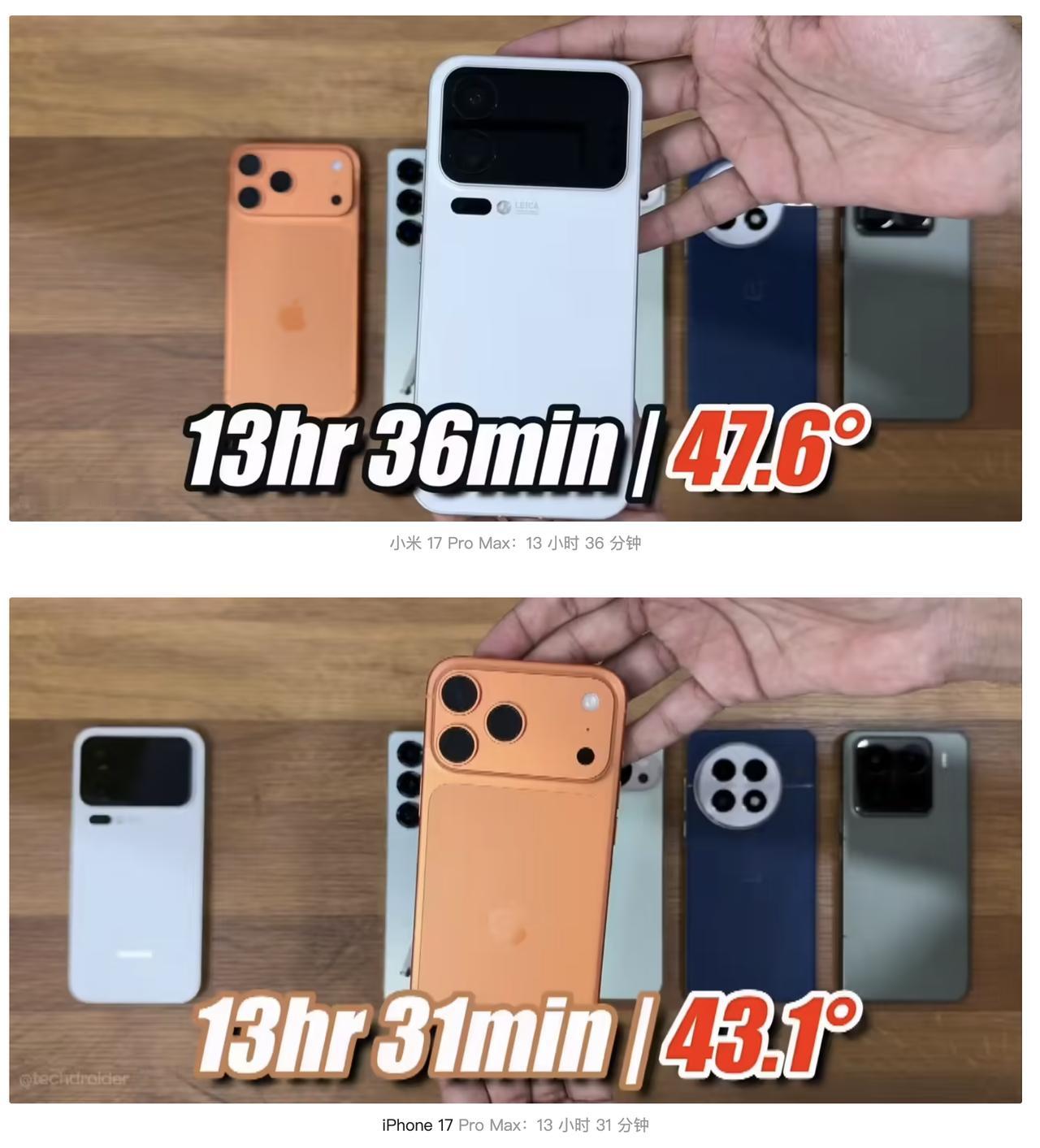 苹果不到5000毫安时的电池,续航媲美安卓7500毫安时的电池??这真的科学嘛?[笑哭][震惊]很多人说苹果续航差,其实这些年苹果的超大杯续航还是可以的,最近TechDroider就测试了最新的iPhone17ProMax,对比7500毫安时的小米17ProMax的续航,结果只差5分钟!小米17 Pro Max坚持了13小时36分钟,iPhone17 Pro Max坚持了13小时31分钟。。 不得不服苹果的系统优化和功耗控制确实牛啊!安卓现在电池越来越大,但是你们真的觉得续航有质的提升吗?5000毫安时和6000毫安时、7000毫安时,搞了半天还是要一天一冲,和iPhone续航对比并没有多大优势。