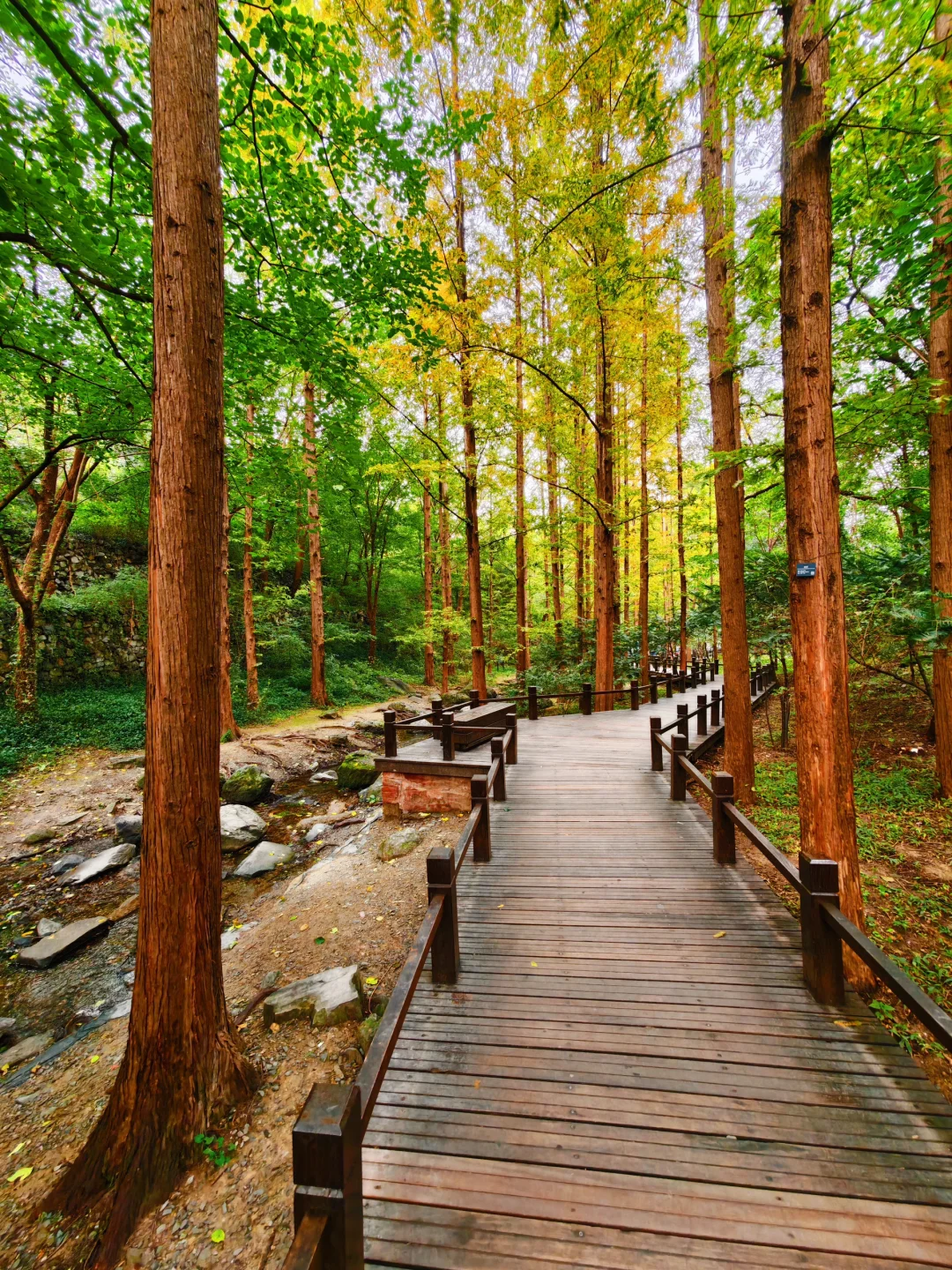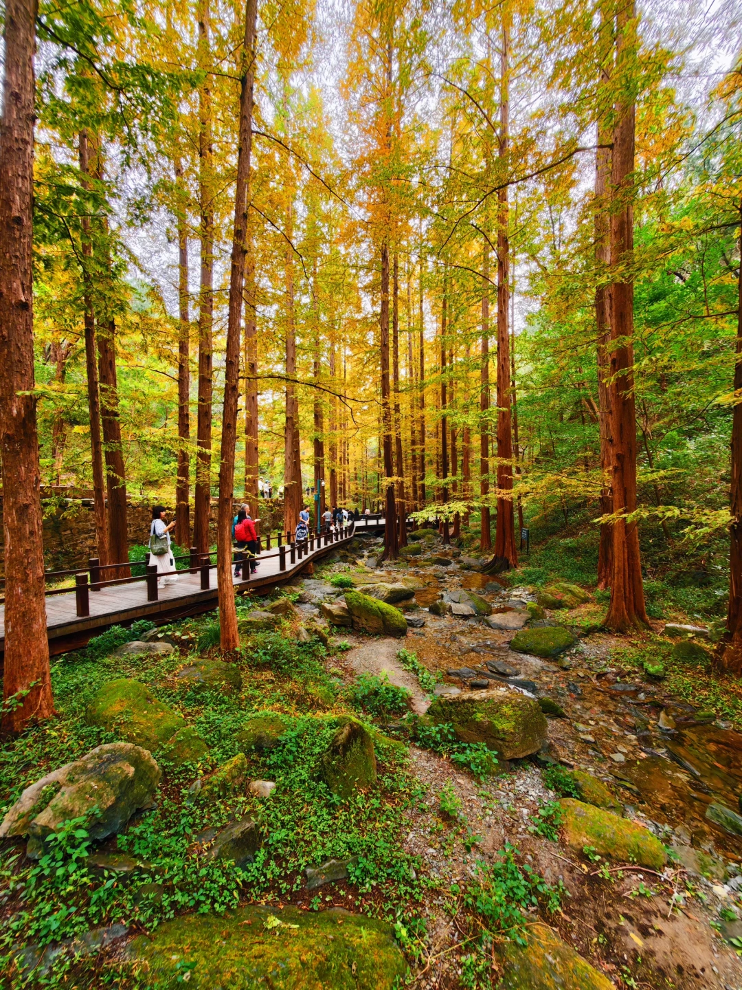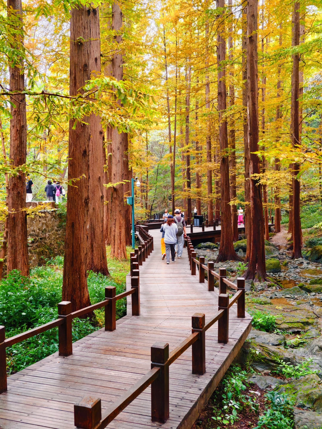 谁还没在秋天闯进这片“红色暮光森林”啊!国家植物园原本翠绿的水杉林,一到秋天就像被大自然打翻了调色盘,深橙、浅红、金黄层层叠叠,阳光透过枝叶洒在红色树影上,再加上9点准时升腾的薄雾,走在木栈道上仿佛闯进了会呼吸的童话世界,每一步都像踩在电影画面里!