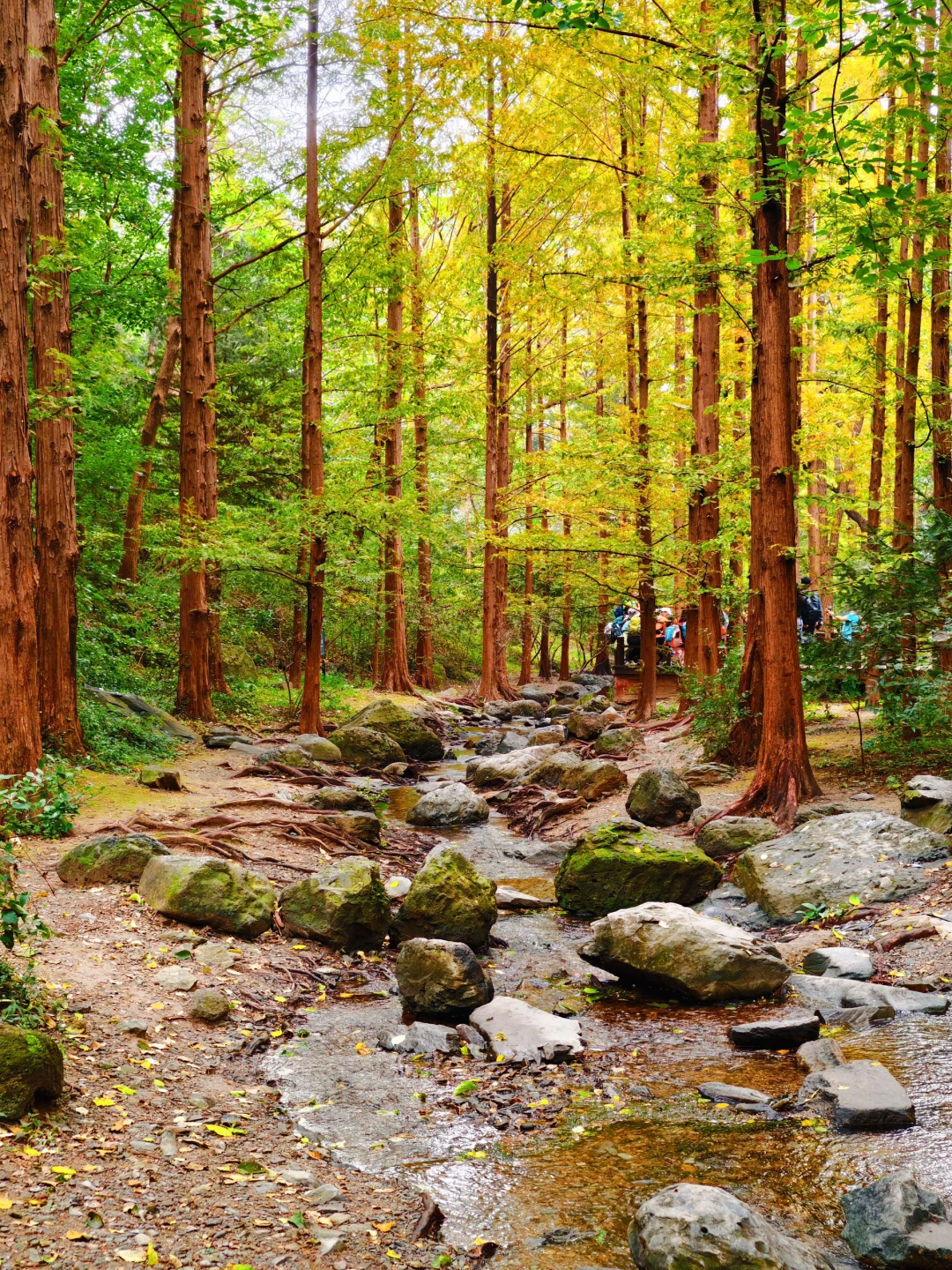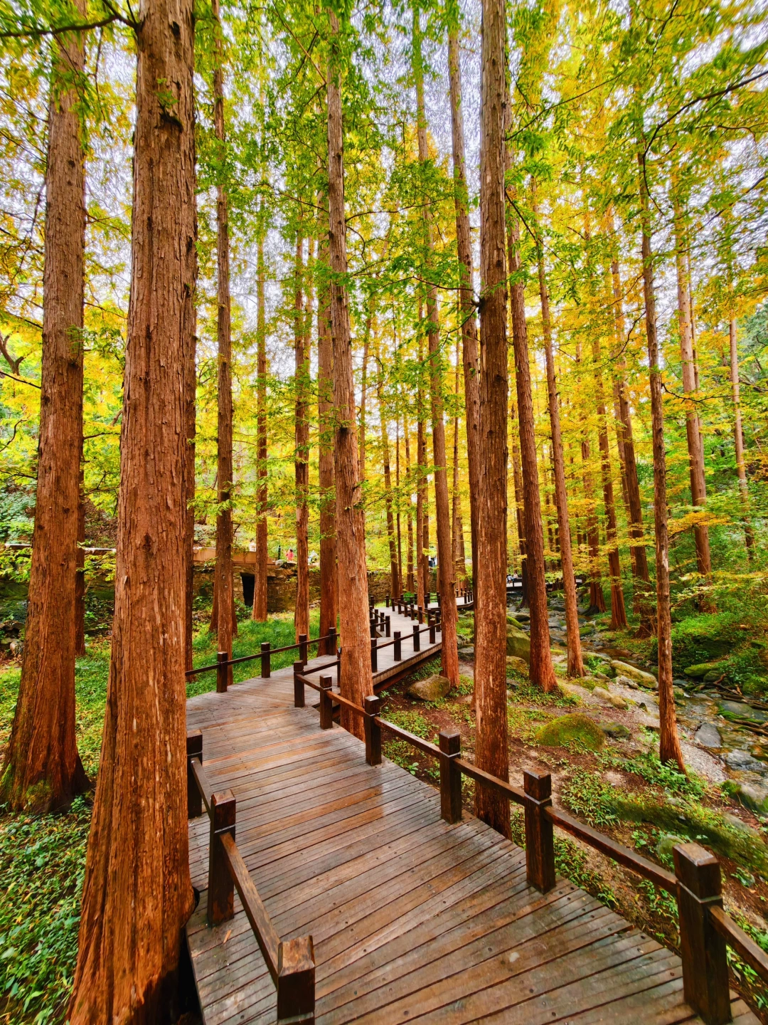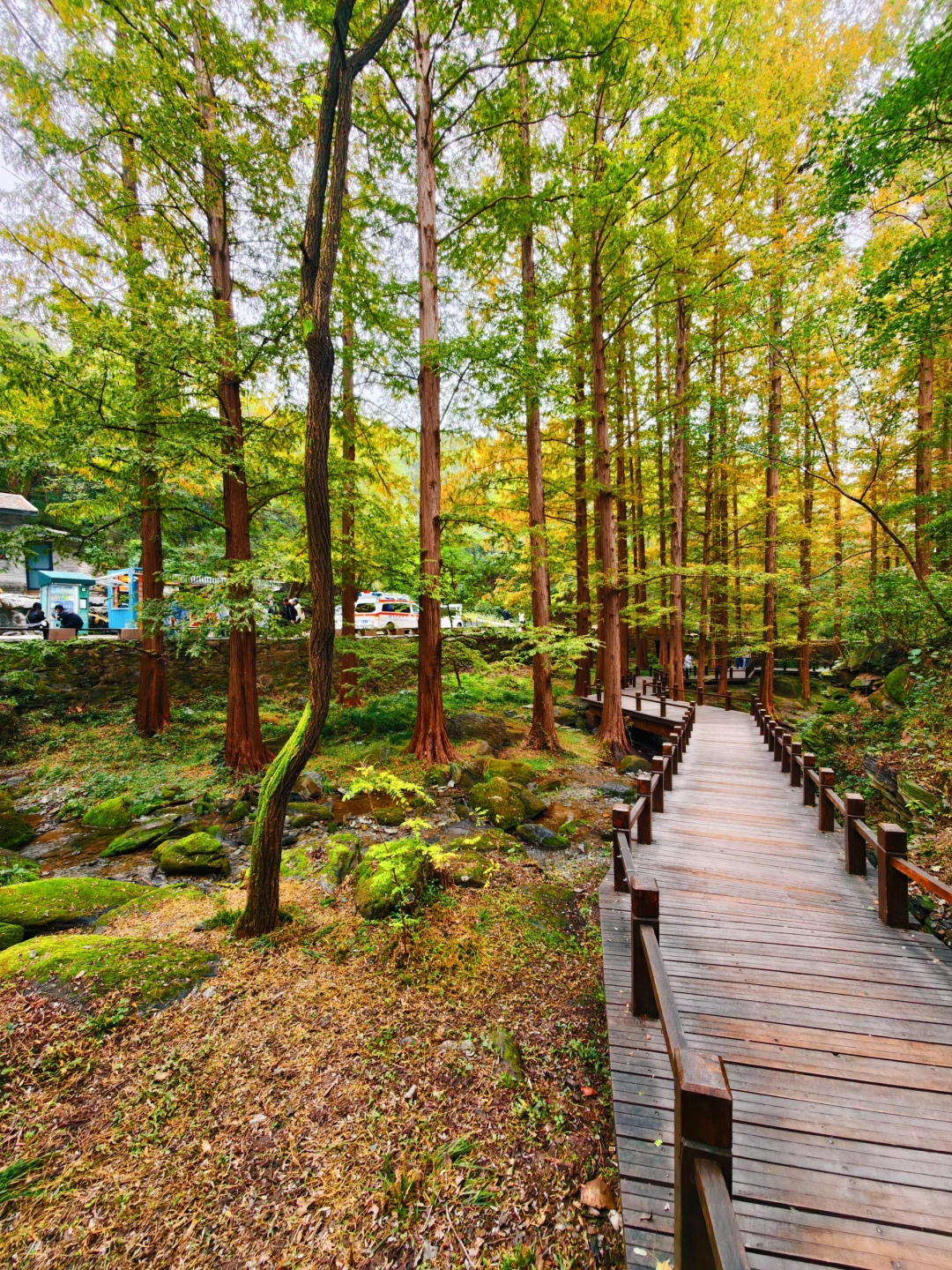 谁还没在秋天闯进这片“红色暮光森林”啊!国家植物园原本翠绿的水杉林,一到秋天就像被大自然打翻了调色盘,深橙、浅红、金黄层层叠叠,阳光透过枝叶洒在红色树影上,再加上9点准时升腾的薄雾,走在木栈道上仿佛闯进了会呼吸的童话世界,每一步都像踩在电影画面里!
