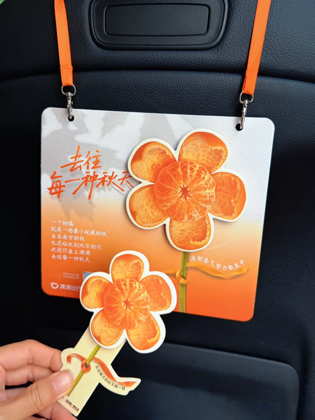 本来还在为赶路烦,结果一坐进车里瞬间被戳中心巴——椅背挂着一个超可爱的香卡,以前打滴滴,只见过那种小小的香卡,但是真的闻不到啥味道。这次不一样!一上车就闻到了淡淡的柑橘香,是那种独属于南方秋天的,酸甜感,就像刚剥开的新鲜橘子。清爽感直接拉满,晕车都给我治好了。滴滴你不要然进香水赛道呢= =