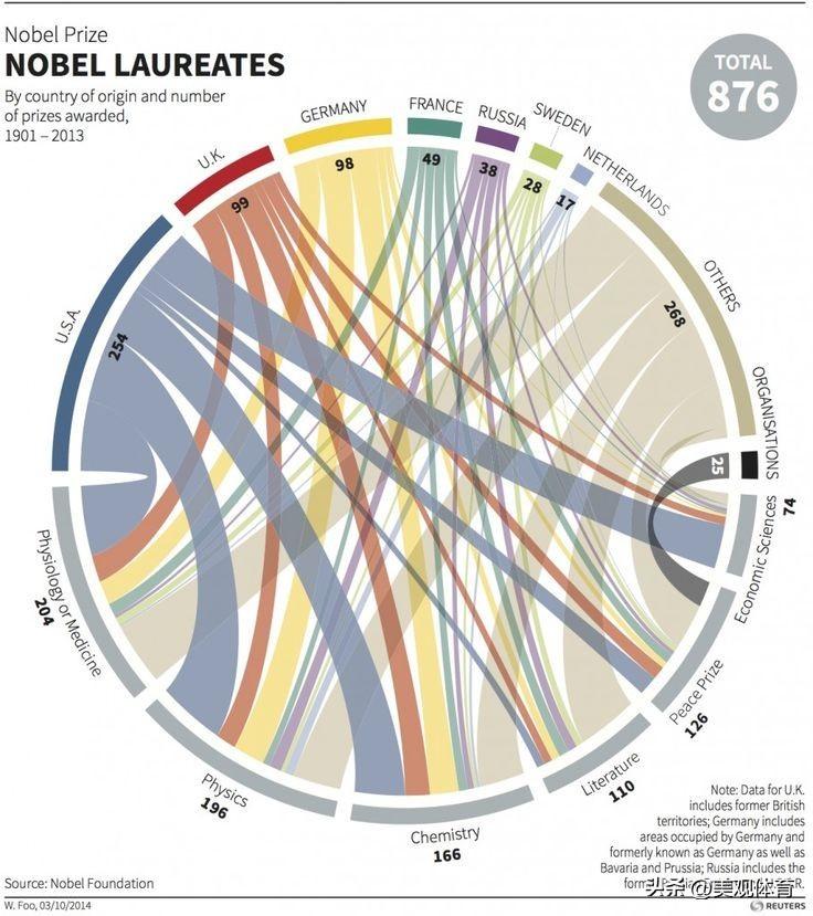 诺贝尔奖获得者国籍及所获奖项分布图 (1901~2013年) (可以更新一下数据)