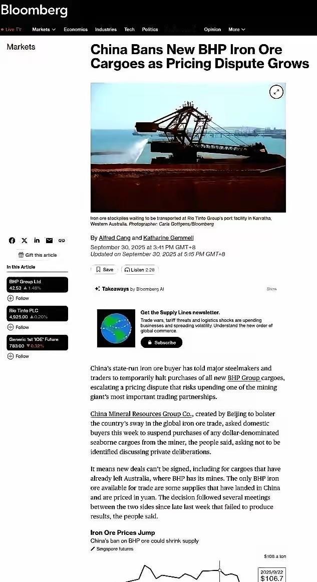 中国拿第三大铁矿石供应商开刀 然而,必和必拓不信邪,坚持高价,谈了好几天,所有新合同被暂停,包括正在运输过程中的,必和必拓,85%的铁矿石销往中国,60%的业务在中国,是中国第三大铁矿石供应商。 网友表示,这次是真的有备而来,几内亚的西芒杜铁矿石项目,预计年产量将达到1.2亿吨,2025年9月19日已正式启动首批开采作业,11月份首批铁矿石将会发运中国,再加上回收废钢铁,房地产疲软,用钢量下降,才会和澳大利亚议价的,中国不打无准备之仗,肯定有后手。 咱就说这事儿啊,中国这次可真是沉得住气,以前买铁矿石那基本就是人家说啥价咱就得认啥价,现在不一样了,腰杆硬了,知道跟他们掰扯掰扯了,必和必拓还觉得自己牛得很,死咬着高价不松口,那咱就只能暂停合作呗,反正咱也不是离了他们就不行。 几内亚那个西芒杜项目就是咱的底气,1.2亿吨的年产量可不是闹着玩的,等11月份第一批铁矿石运过来,看他们还敢不敢这么嚣张,而且现在回收废钢铁也在加大力度,房地产虽然疲软用钢量下降了,但这也是个调整市场的好机会,正好可以借着这个时机重新制定游戏规则。 再说了,这事儿可不光是铁矿石这一块,以后石油说不定也得用人民币结算呢,这就是趋势,这就是市场规律,只要不是那种全世界独一份谁都离不开的东西,那买家肯定就得说了算,咱中国现在就是买家里的老大,那自然就有话语权。 以前咱可能还稍微有点弱势,但现在不一样了,各种布局都已经开始了,不管是铁矿石还是石油,咱都有后手,不会让他们随便拿捏的,这就好比打仗一样,咱得先把自己的粮草弹药准备好,然后再去跟敌人谈判,这样才能占据主动。 中国这些年发展得太快了,很多以前被别人卡脖子的事情现在都在慢慢解决,这就是实力的体现,咱有资源有市场有技术,凭什么还要受别人的气。 这次跟必和必拓的博弈就是一个很好的开始,让那些老外知道知道,中国现在可不是好欺负的,咱有自己的打算有自己的计划,不会盲目跟风也不会轻易妥协,以后这种事情肯定会越来越多,咱就等着看他们怎么应对吧。 各位读者你们怎么看?欢迎在评论区讨论。