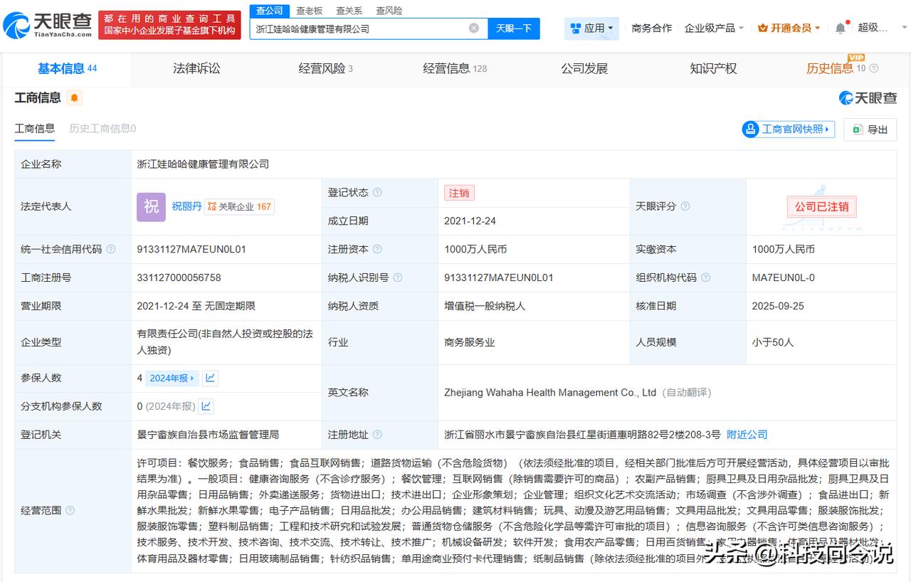 【宗馥莉名下娃哈哈健康管理公司注销 浙江娃哈哈健康管理公司注销】 天眼查App显示,近日,浙江娃哈哈健康管理有限公司登记状态由存续变更为注销。此前,该公司已发布简易注销公告。 该公司成立于2021年12月,法定代表人为祝丽丹,注册资本1000万人民币,经营范围包括餐饮服务、食品销售、食品互联网销售等,由娃哈哈商业股份有限公司全资持股。主要人员信息显示,宗馥莉为该公司董事。 天眼查信息: