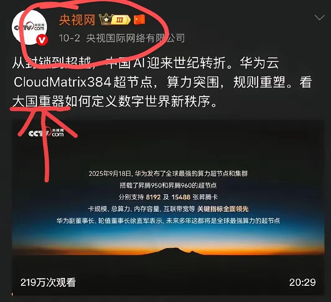 芯片明明还卡着脖子呢, 怎么一转眼, AI算力就成了人家的两倍, 还领先一代? 我一开始也有点懵,后来仔细想想,华为这招太绝了。 你不是在路上堵我吗? 行,我不走这条路了。我直接飞过去。 网友评论: 不要吹牛欺骗中国人。几百个性能还赶不上别人几十个芯片,而且发热大,生态差,软件也有缺陷,国内几家都比它的好,例如寒武纪 央视网时而权威,时而不权威,报道华为时权威, 报道别人时又变得不权威,好奇怪!