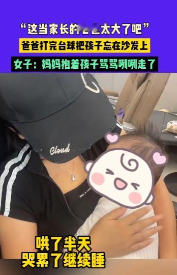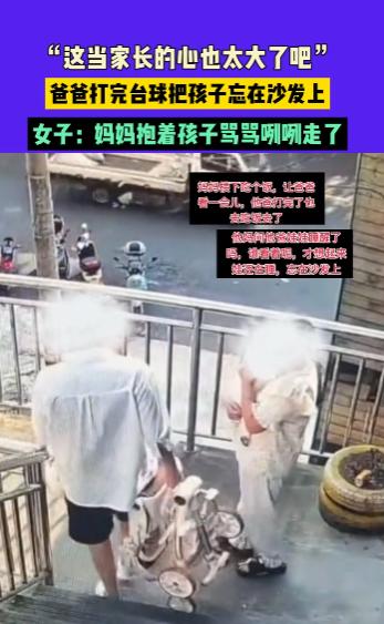“离了个大谱!”10月8日,浙江,一男子打完台球将自己几个月大的孩子忘在沙发上独自离去,妻子焦急地来到台球厅寻找孩子,抱着孩子对男子骂骂咧咧,网友:这亲爹也太不靠谱了! 相比妈妈来说,很多爸爸带孩子时非常粗心大意,常常会做出一些离谱的事情,这也导致很多宝妈不放心将孩子交给自己的老公看。 一男子带着家人来到台球厅打台球,男子妻子肚子饿了下楼吃饭,临走前嘱咐男子一定要看好孩子,谁知,打完台球后粗心的男子直接独自离去,他早已经忘了自己几个月大的孩子还躺在沙发上。 孩子的哭声引来了台球厅老板娘,她发现孩子后赶忙四处寻找孩子的父母,可不管怎么叫都没人应答,无奈之下,老板娘只能亲自上阵哄孩子睡觉。 看这男子独自下来找自己,妻子一脸疑惑,问孩子的位置,男子这才想到自己的孩子还在台球厅里,夫妻两人也顾不上手里的东西了,赶紧跑上楼去。 所幸,在老板娘照顾下,孩子安静地睡了,男子妻子赶忙上前接过孩子,随即对着男子骂骂咧咧,两人就这样前后脚出了店门。 不少网友认为男子的心太大了,忘什么都可以理解,可连自己的孩子都能忘,这亲爹当得也太不称职了! 信息来源:《“这当家长的心也太大了吧”,爸爸打完台球把孩子忘在沙发上,女子:妈妈抱着孩子骂骂咧咧走了》大参考