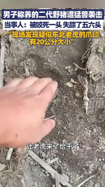 “太吓人了!”10月8日,黑龙江牡丹江,一男子家养的二代野猪被猛兽袭击,1头被咬死,还有5、6头失踪,现场发现疑似野生老虎的脚印,直径约有20公分大小,网友:这老虎吃饭还挺挑食! 东北的野生动物出了名的多,咱们熟知的东北虎、熊等猛兽基本上都能在东北看到,这些猛兽的攻击力不用多说,常常能听到它们捕食附近居民养殖动物的消息。 一男子在养了一群二代野猪,二代野猪就是家猪与野猪杂交的后代,它们的生长速度快,瘦肉率高,但却带有野猪基因里的攻击性,所以男子将这群猪养在了村外。 近段时间男子发现这些猪的数量越来越少,前后失踪了5、6头,虽然他心中有些怀疑,但始终未找到猪的尸体。 这天,男子像往常一样到村外查看野猪的状况,竟然发现有一头猪死在了田里,它的屁股被吃了,后面是一个血淋淋的大洞,在其周围还发现了一个直径约有20公分大小的野兽脚印。 男子发现这个脚印与东北虎的脚印有些相似,但不能确认,之前失踪的那些野猪估计也都被这个猛兽捕食了,这下他的损失可惨重了。 不少网友表示可以找专家来鉴定一下,如果确认是东北虎,说不定可以获得一部分补偿,还有一些人对野猪的死状进行了分析,表示这有可能是别的猛兽干的,不管是什么猛兽,就在村子旁边还挺吓人的! 信息来源:《男子称养的野猪遭猛兽袭击,当事人:被咬死一头 失踪了五六头,现场发现疑似东北老虎的爪印有20公分大小》大象新闻