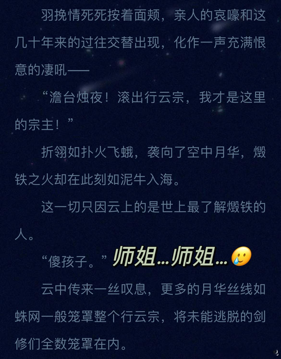 后期世界观的展开很宏大,关于师门关于灭虚尊主关于天外来物的探讨还是很新鲜的。很喜欢师姐羽挽情和女主李忘情之间看似针锋相对实际上却默默关心彼此的情谊,结局的时候这里写的很感人。