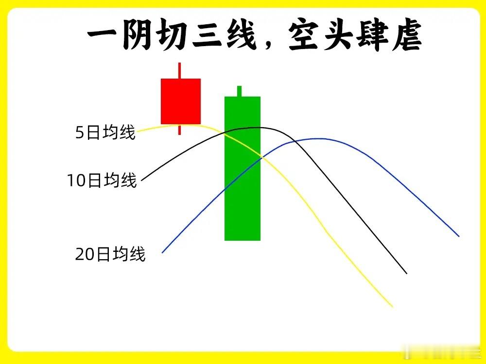 上涨趋势的末期, 5 日、10 日和 20 日均线处于多头趋势,出来开始高位出货,股价开始拐头下行,股价出现一根中大阴线,一口跌破三根均线,此时成交量还出现放大。说明上涨趋势已经出现变化,阴线越大,成交量越大,说明抛压就越大。一旦出现这种均线走势,我们就要谨慎