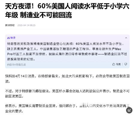 美国桥水基金创始人爆料,老美制造业无法回流不是因为受教育程度高,不愿意干!而是因为美国60%人口受教育程度低于小学六年级,干不了!精英永远在哪里都是少数啊!这事儿听起来夸张,但细想还真有点道理。 桥水基金创始人这话看似说得夸张,实则戳中了美国制造业回流的真正痛点,根本不是大家想的高学历者不愿进厂,而是多数人压根没能力干这份活。不少人之前总琢磨,美国年轻人学历高、眼光挑,瞧不上工厂里的体力活,可真要是走进现在的制造车间,就知道这种想法有多脱离实际。 如今的工厂早不是几十年前靠力气拧螺丝的光景了,哪怕是最基础的装配岗,都得对着电子图纸找零件位置,操作带触摸屏的精密设备,还得会看实时数据调整参数,这些活儿哪是没读过几天书的人能拿得下来的? 真不是危言耸听,美国一大半人口连最基础的读写算都费劲,别说看懂技术图纸,有时候连设备上的英文操作说明都认不全,更别提处理简单的机械故障了。 之前总有人说美国人“懒”“怕吃苦”,可实际上,美国制造业工人的工资比不少服务业岗位高出一截,时薪能到二三十美元,要是真能胜任,哪会没人愿意干?问题就出在“胜任”这两个字上——有家国际铸铁厂因为关税政策订单涨了25%,可招进来的新员工能撑过半年的连一成也没有,不是他们不想干,是连最基本的高温金属操作规范都学不会,企业总不能花几个月从小学算术补起,成本根本扛不住。 美国的基础教育早就埋下了这颗雷。那些低收入社区的学校,教学楼年久失修,老师工资低得留不住人,课程里连最基础的工业技术启蒙都没有,很多孩子初中没读完就辍学打工,一辈子只能干些端盘子、送快递的体力活,压根没机会接触制造业需要的技能。 反观咱们常说的“精英”,确实有,哈佛、MIT毕业的人才一抓一大把,但这些人是搞芯片研发、做企业管理的,不是去工厂操作机床的。制造业要想运转起来,需要的是成千上万的熟练技术工人,可美国恰恰在这部分“中间人才”上断了层。 现在美国制造业光空着的岗位就快50万个了,比十年前多了近四成,近半数老板都把“招不到合适的人”当成最大难题。就拿特斯拉德州超级工厂来说,之前为了招装配线工人,开出的工资比当地平均水平高20%,结果来了几百个应聘者,最后能留下的不到三分之一。 不是这些人不想干,是面试时连简单的电路示意图都看不懂,实操环节连电动扳手的扭矩都调不明白,企业总不能把生产线停下来教基础常识吧?还有些汽车零部件厂想从亚洲迁回美国,考察了几个州之后又打了退堂鼓,老板直言:“不是政策不好,是找不着能上手的工人,总不能把机器空运过来当摆设。” 更关键的是,美国想回流的还不是低端制造业,大多是新能源、高端装备这种技术密集型领域,对工人的要求更高。比如生产锂电池的工厂,需要工人懂基本的化学配比原理,还要会操作精密的检测设备;制造工业机器人的车间,哪怕是组装环节,都得知道传感器的校准方法。 这些技能别说小学没毕业的人,就算是高中毕业没学过技术的,都得从头学起。可美国的职业教育又跟不上,社区学院的课程老旧,跟企业的实际需求完全脱节,教出来的学生还是不符合要求。 所以说,之前那种“高学历不愿干”的说法,其实是把问题搞反了。美国真正缺的不是不愿进厂的高学历者,而是能撑起制造业的技能型工人,而这背后的根子,就是基础教育的严重滑坡。 一大半人连小学水平都达不到,自然形成不了合格的劳动力池,制造业回流只能是喊喊口号。精英再多也没用,他们管不了生产线的日常运转,也替代不了成千上万的一线技工。 说到底,制造业拼的不光是技术研发,更得有扎实的劳动力基础,这块短板补不上,美国的制造业就算勉强搬回去,也撑不了多久。