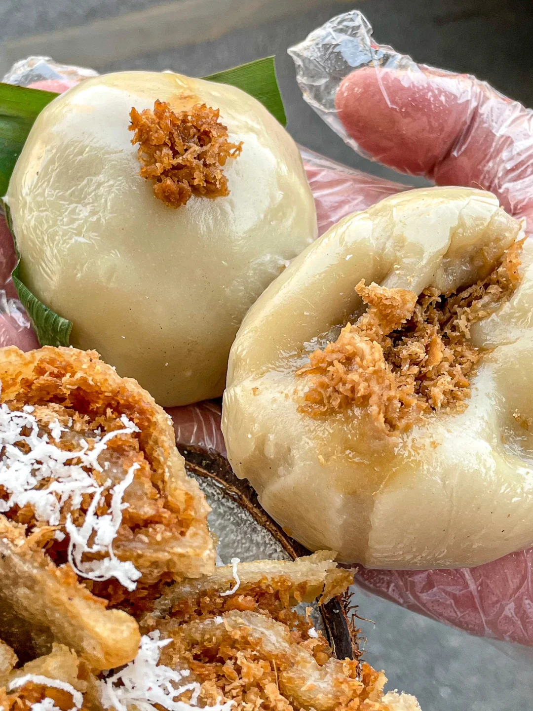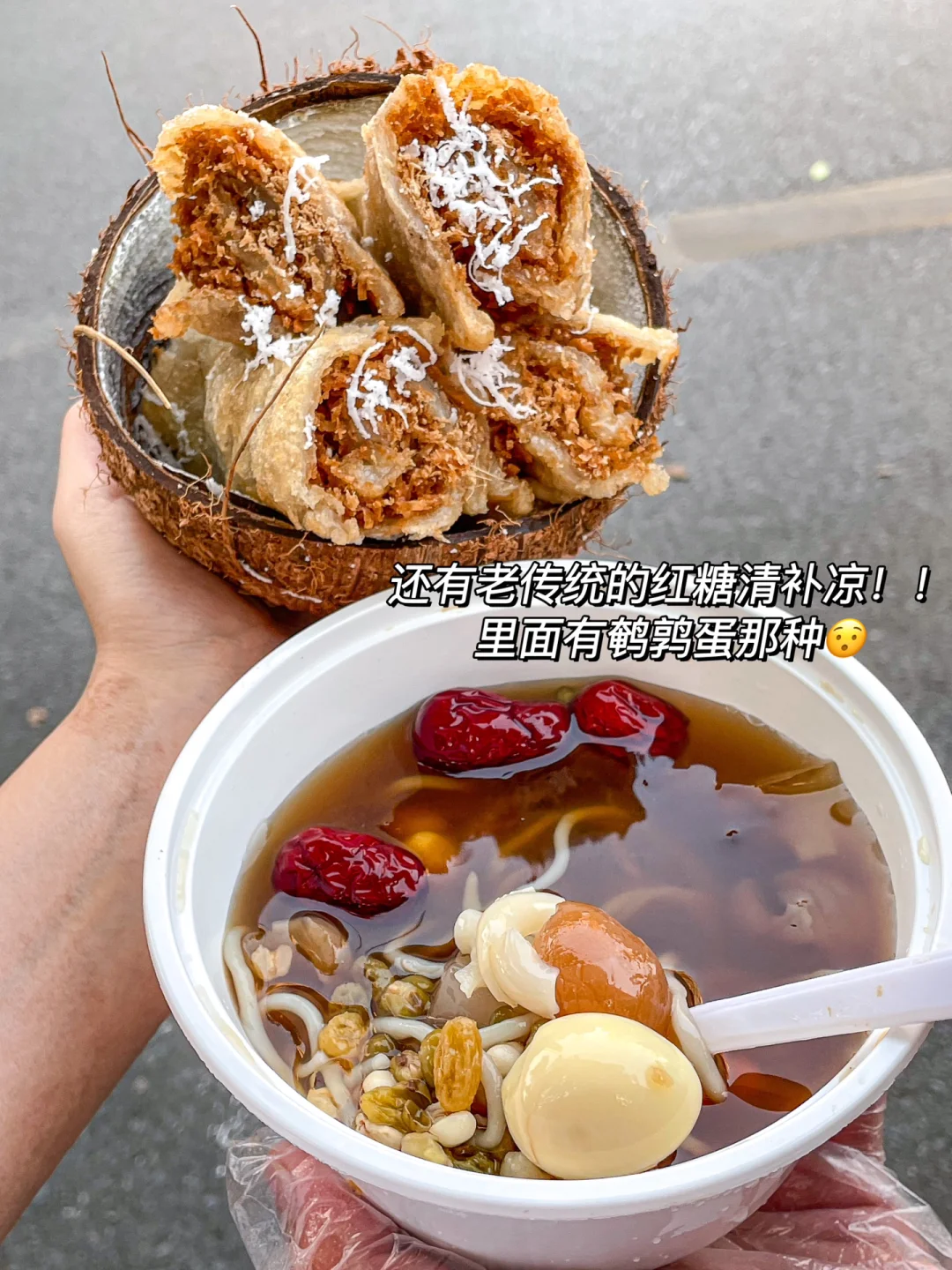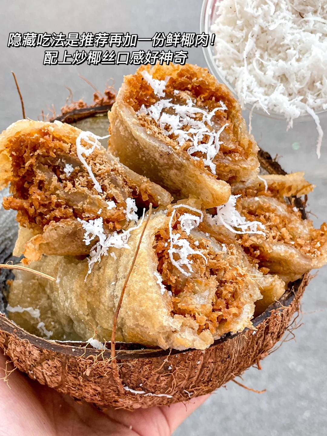 一定要趁热吃!外脆里糯是什么神仙口感!里面还包了很油香的椰丝,甜甜的红糖,脆脆的姜丝!口感好丰富我震惊,吃完真的好想传送去海南!!