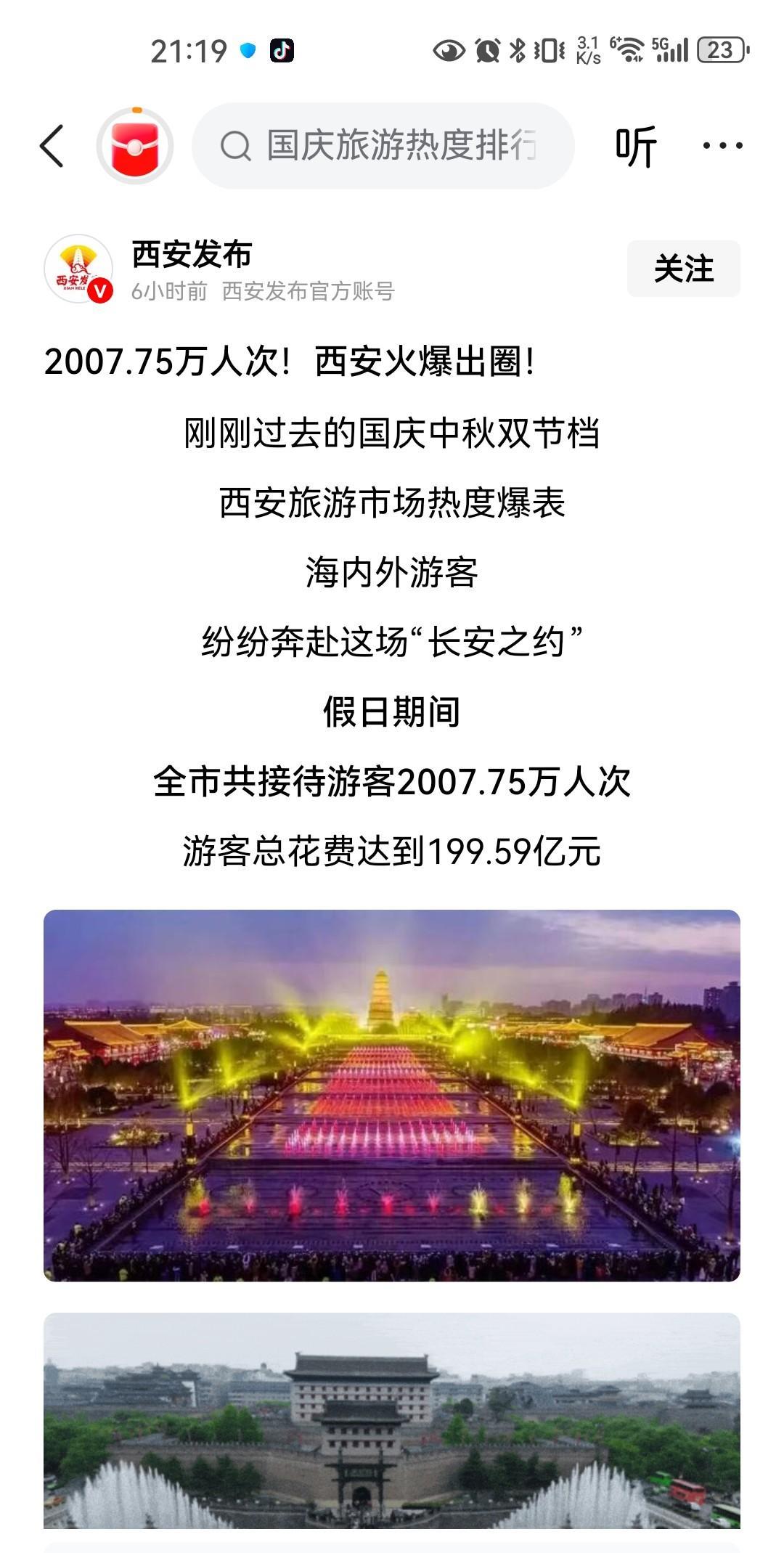 我错了! 节前专门发了帖子,觉得连续多日降雨会降低西安的旅游热度,还觉得上一次的1700多万人次已是巅峰。 结果没想到,啪啪被打脸。 在天公不作美的情况下,西安再次令人刮目相看,以2007.75万人次的热度再次刷新纪录,位居全国第三! 这么高的人数,肯定会对部分游客的旅游体验感造成一定影响。