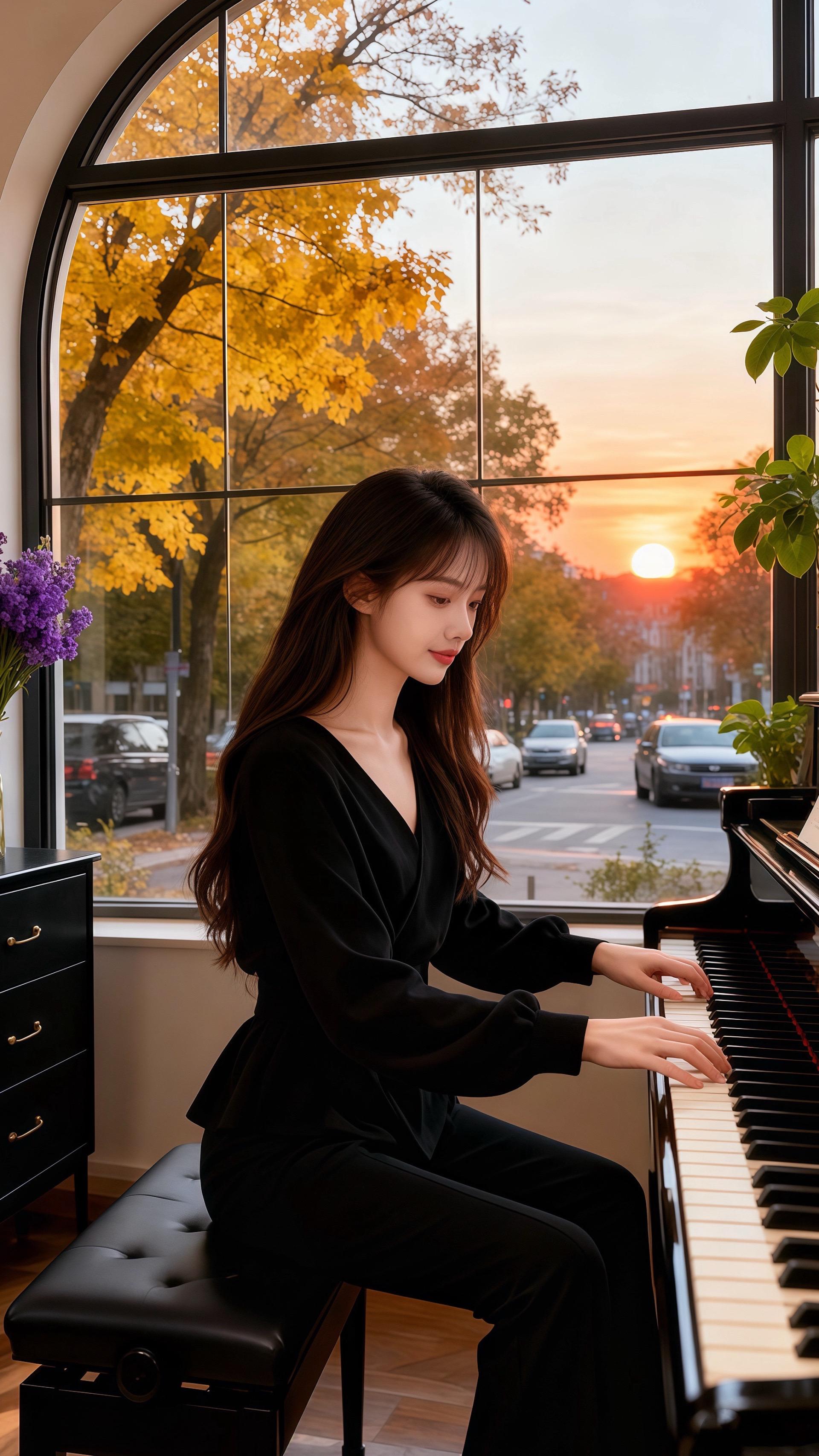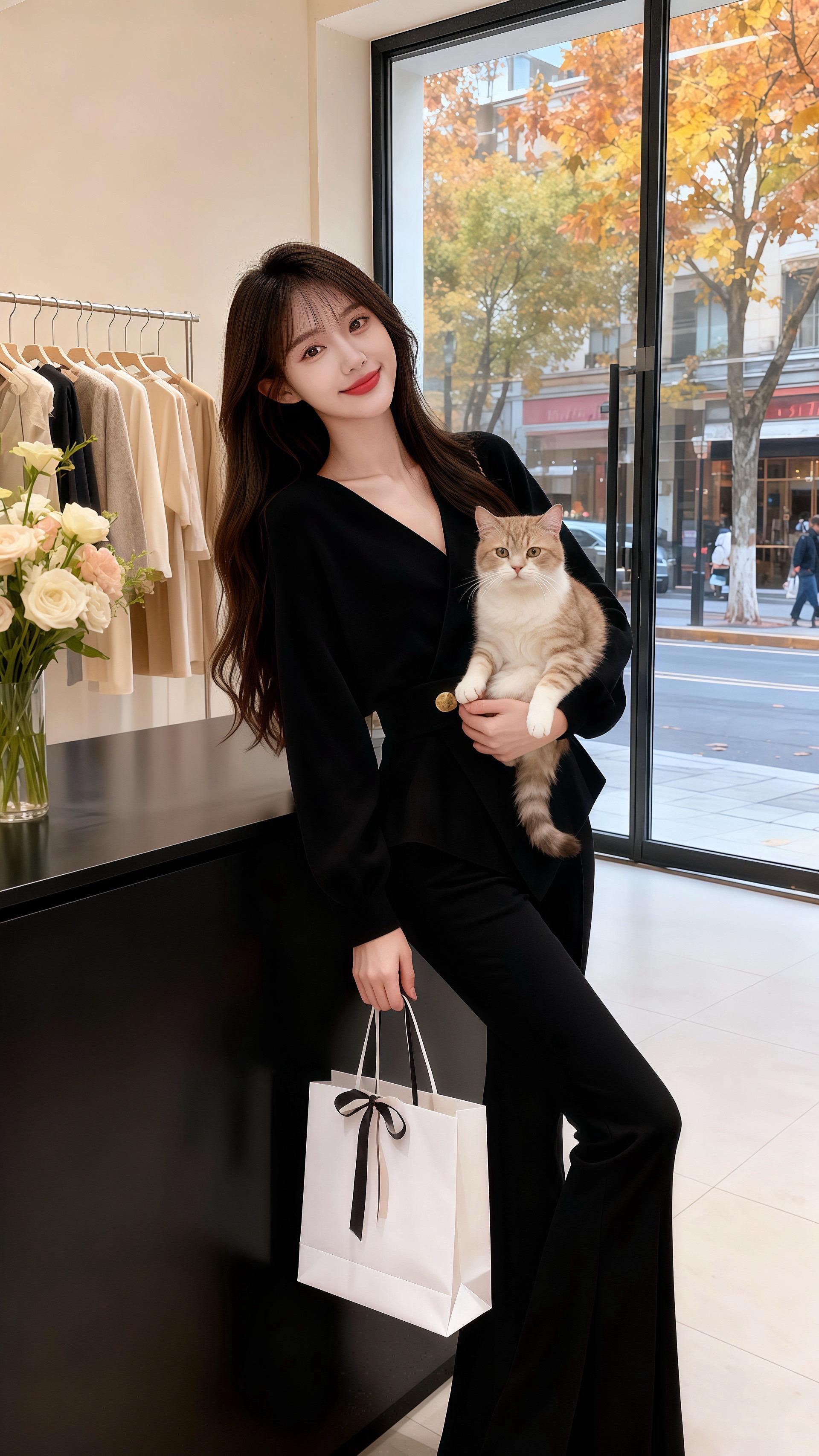 秋日的午后,阳光透过服饰店的落地窗,给许妍周身镀上一层暖黄。她抱着猫咪,一身黑色V领套装衬得身姿窈窕,喇叭裤脚随着她的步伐轻轻晃动。 “许妍,你今天……很不一样。”皓明推门进来,目光落在她身上,语气带着惊艳,“这套衣服把你的气质衬得特别好,简约又有味道。” 许妍脸颊微红,低头轻捋猫咪的毛。这家她常逛的店,今天因皓明的夸奖,似乎格外温馨。 “喜欢吗?”她抬眸,眼里闪着微光。 皓明走上前,自然地帮她理了理衣角:“很喜欢,喜欢你这样的模样,像把秋日的雅致都穿在了身上。” 猫咪“喵”了一声,仿佛也在附和。