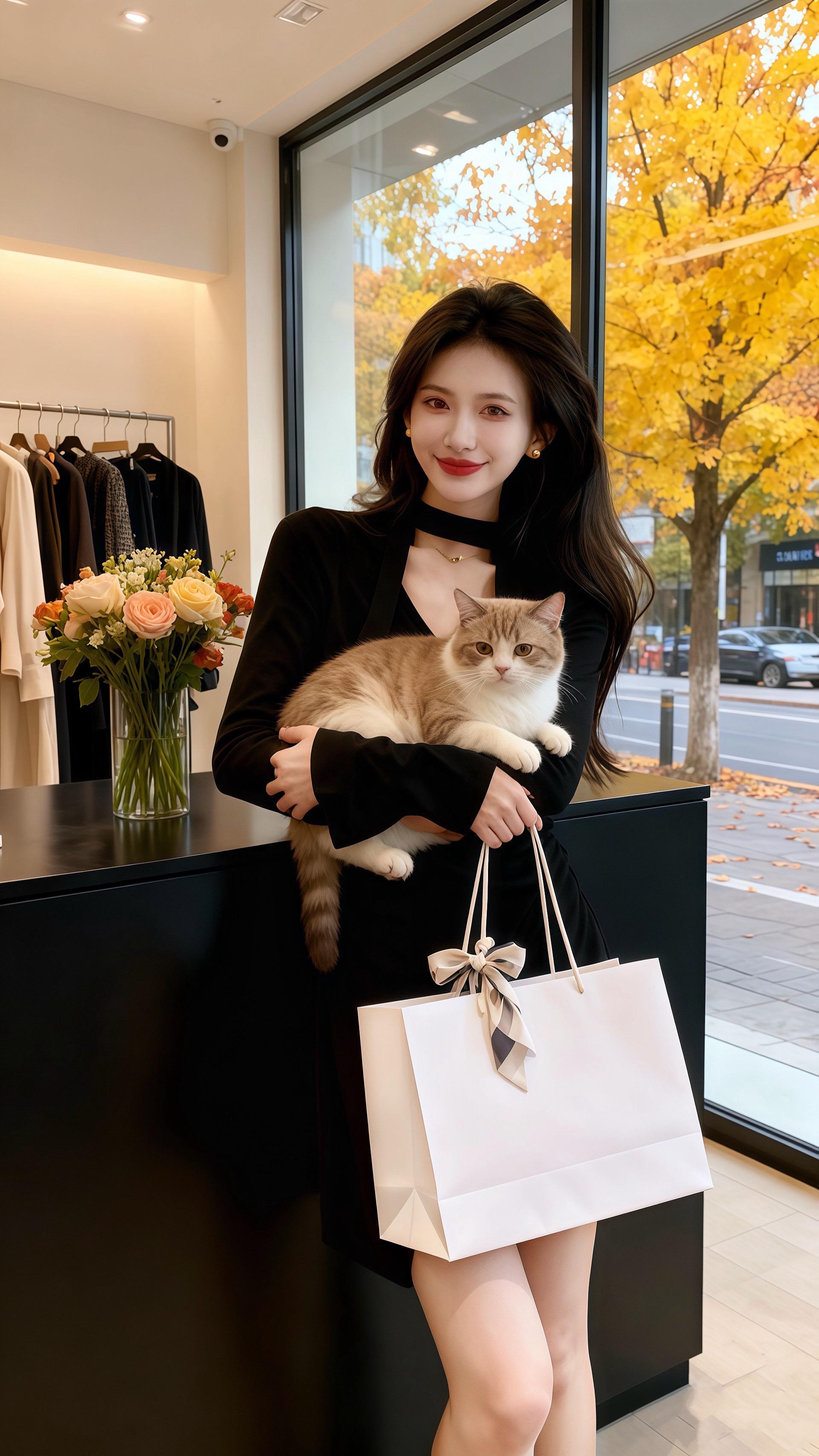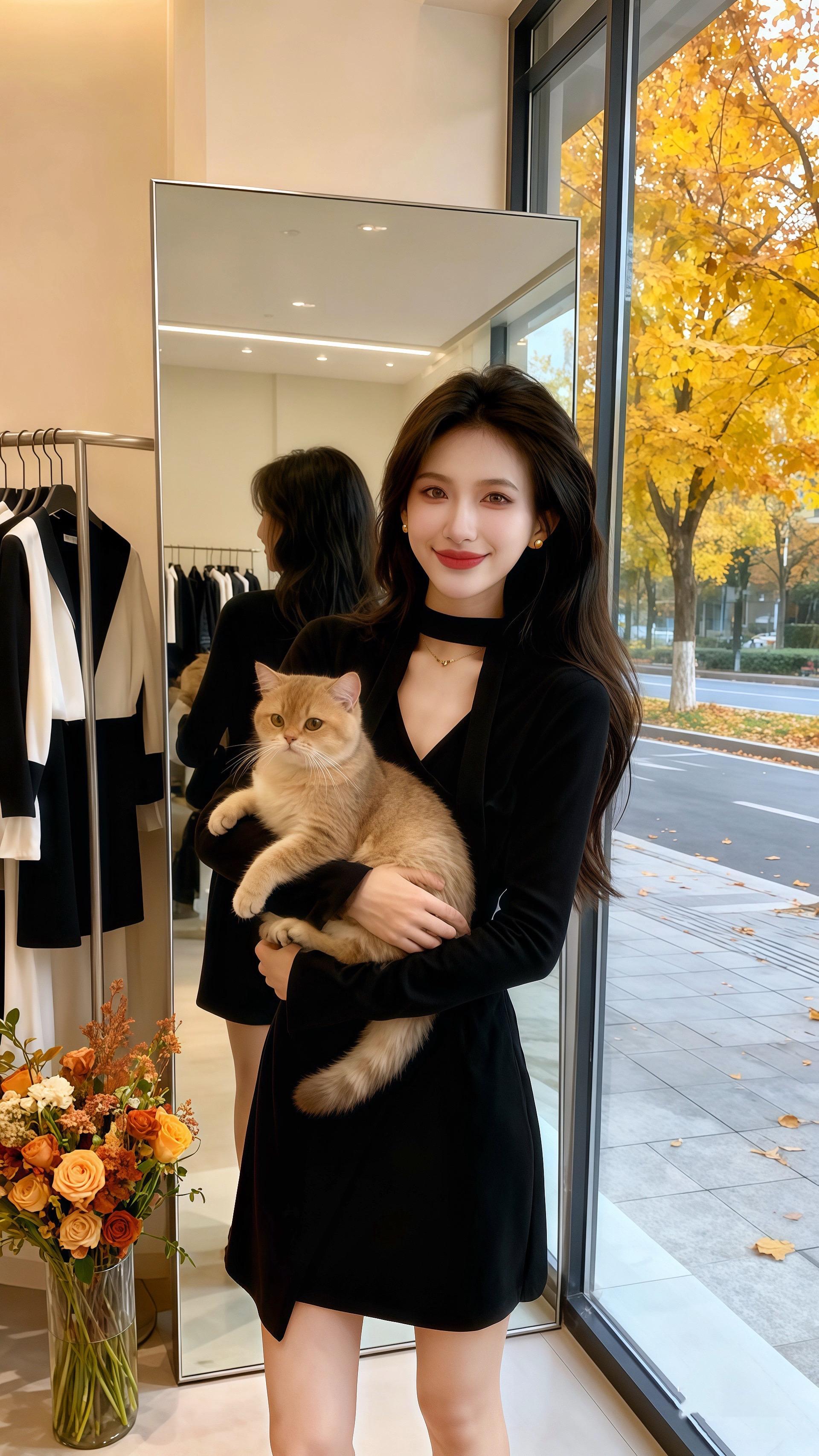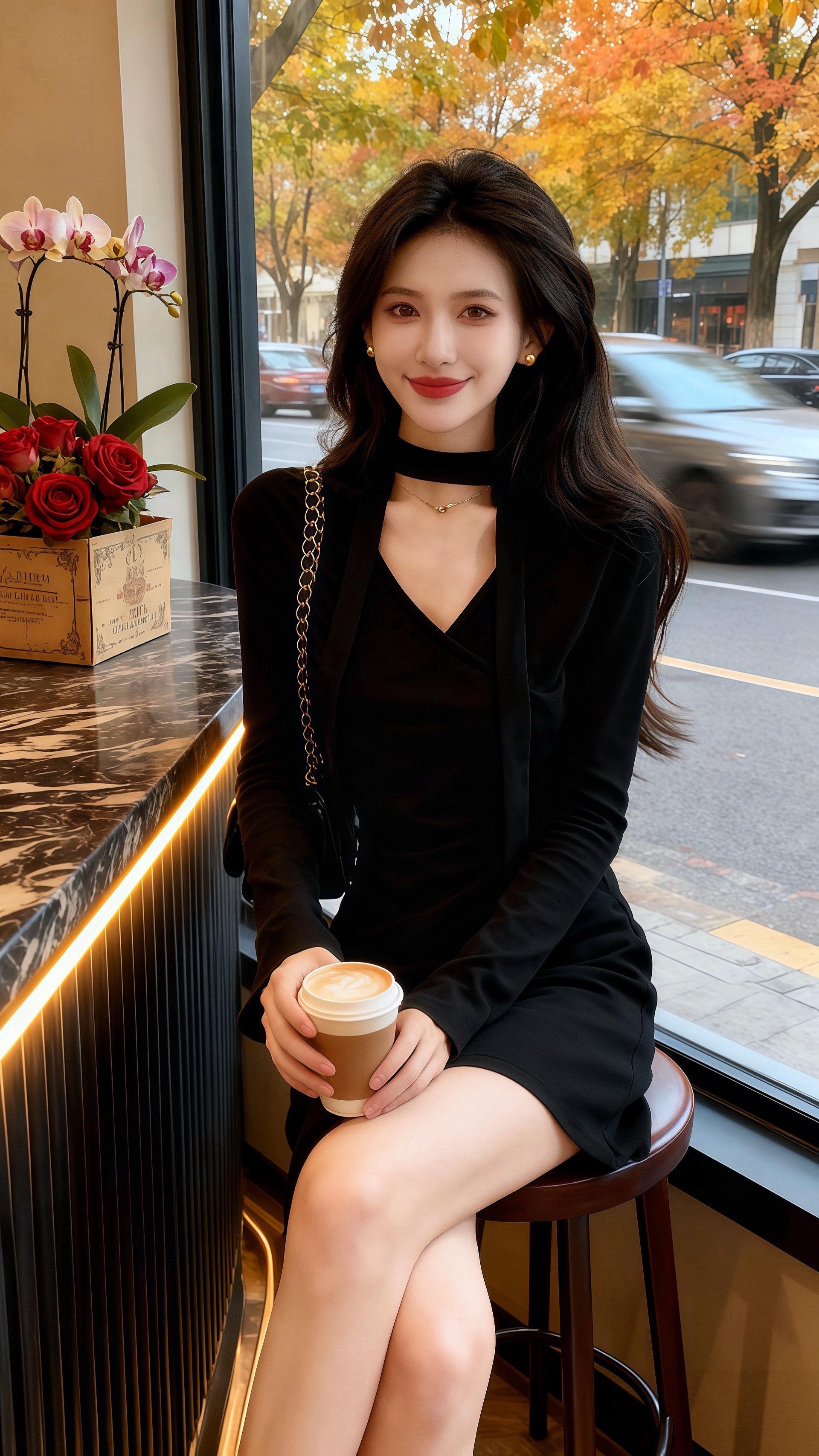 秋日的午后,阳光透过咖啡馆的玻璃窗,洒在许妍身上。她身着一袭黑色连衣裙,领口的设计别致又优雅,长发自然垂落,手持一杯拿铁,笑意温柔。