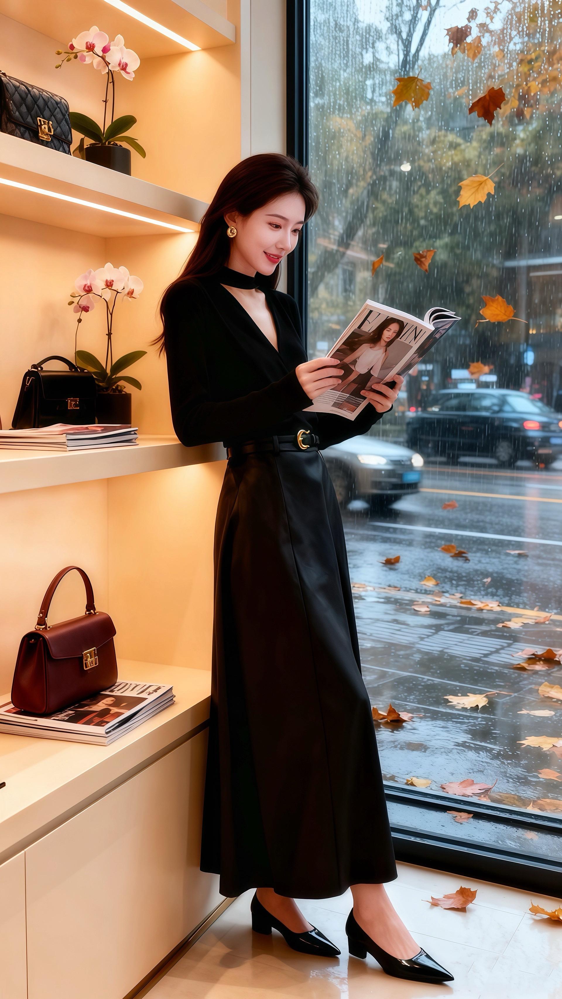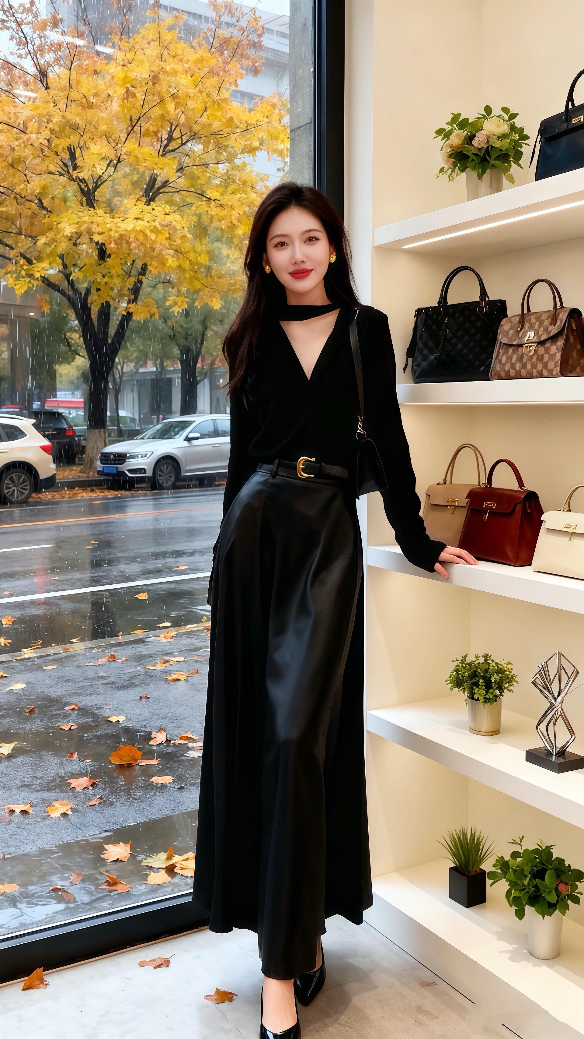 秋日的雨丝敲打着女装店的落地窗,许妍站在白色置物架旁,指尖轻轻拂过架上的艺术摆件。她身着一套黑色穿搭,V领上衣衬得脖颈修长,缎面长裙在暖光下泛着柔和的光泽。