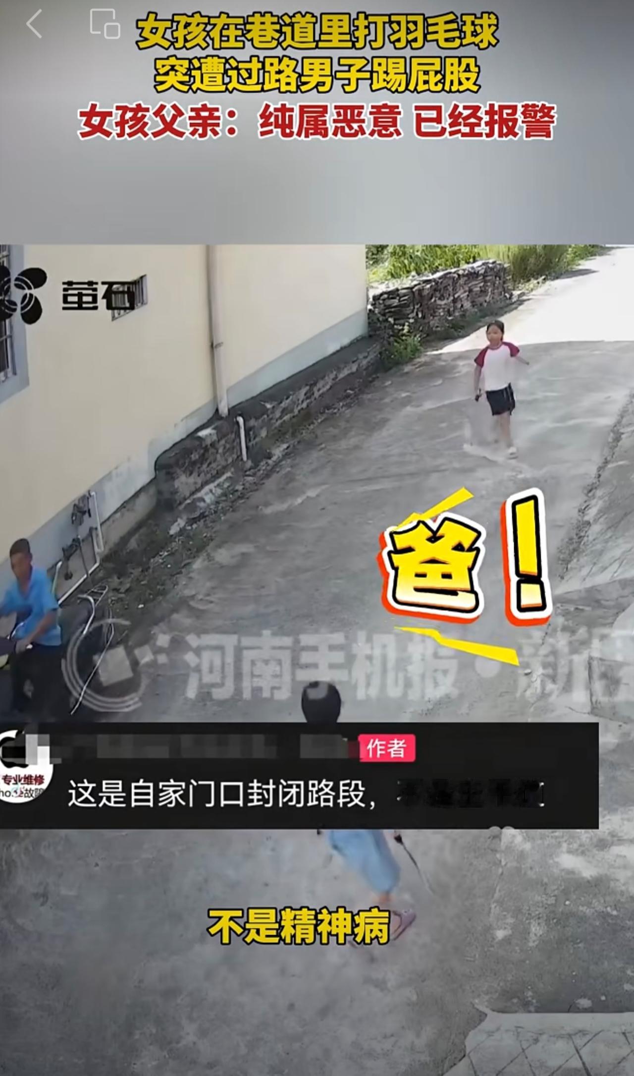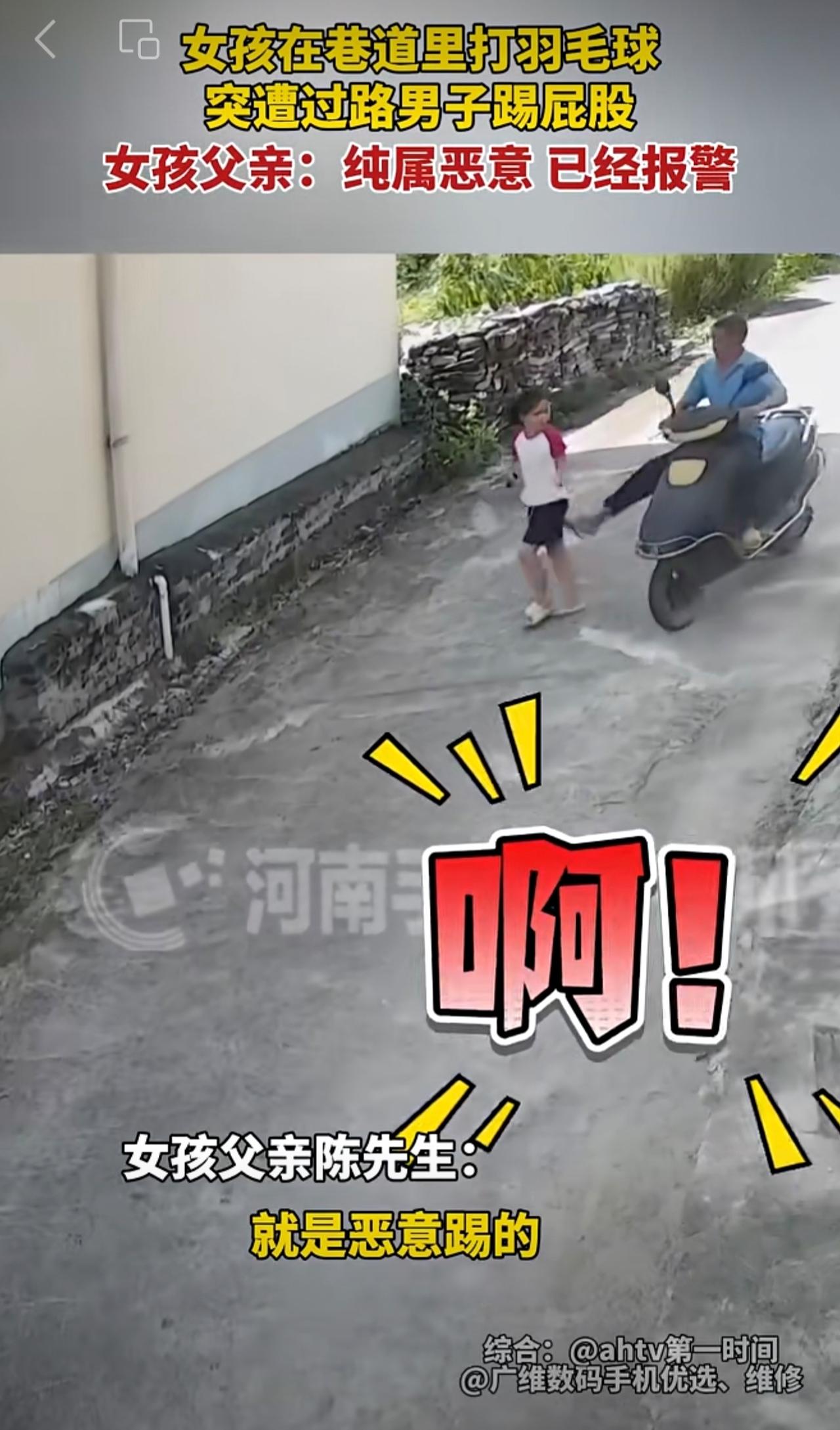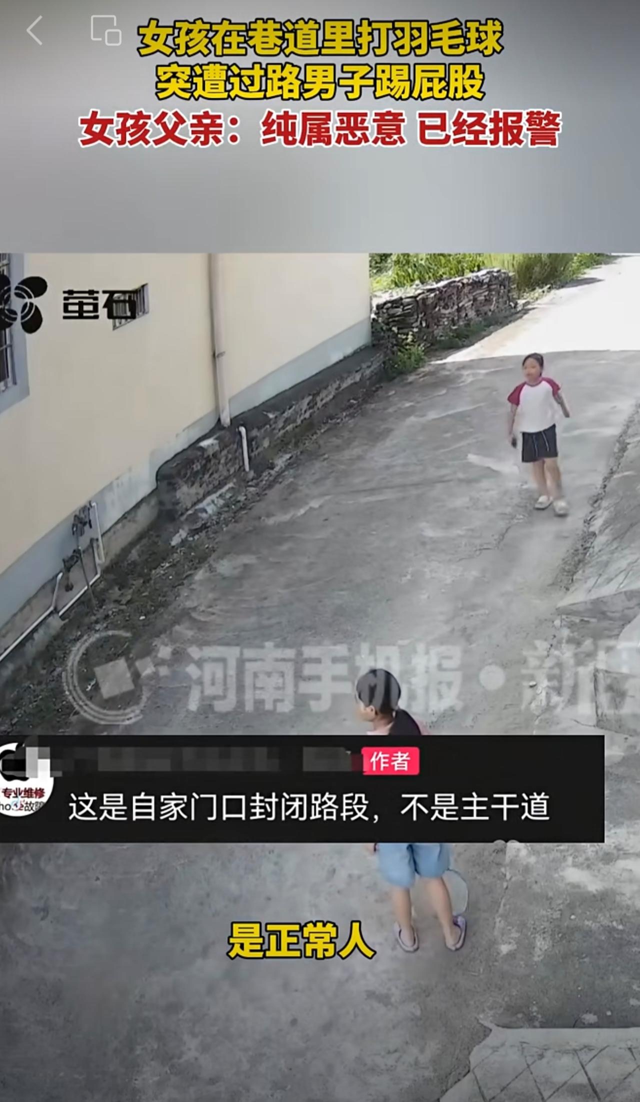 女孩在巷道里打羽毛球,突遭过路男子踢屁股,女孩父亲:“纯属恶意,已经报警。”保护女孩