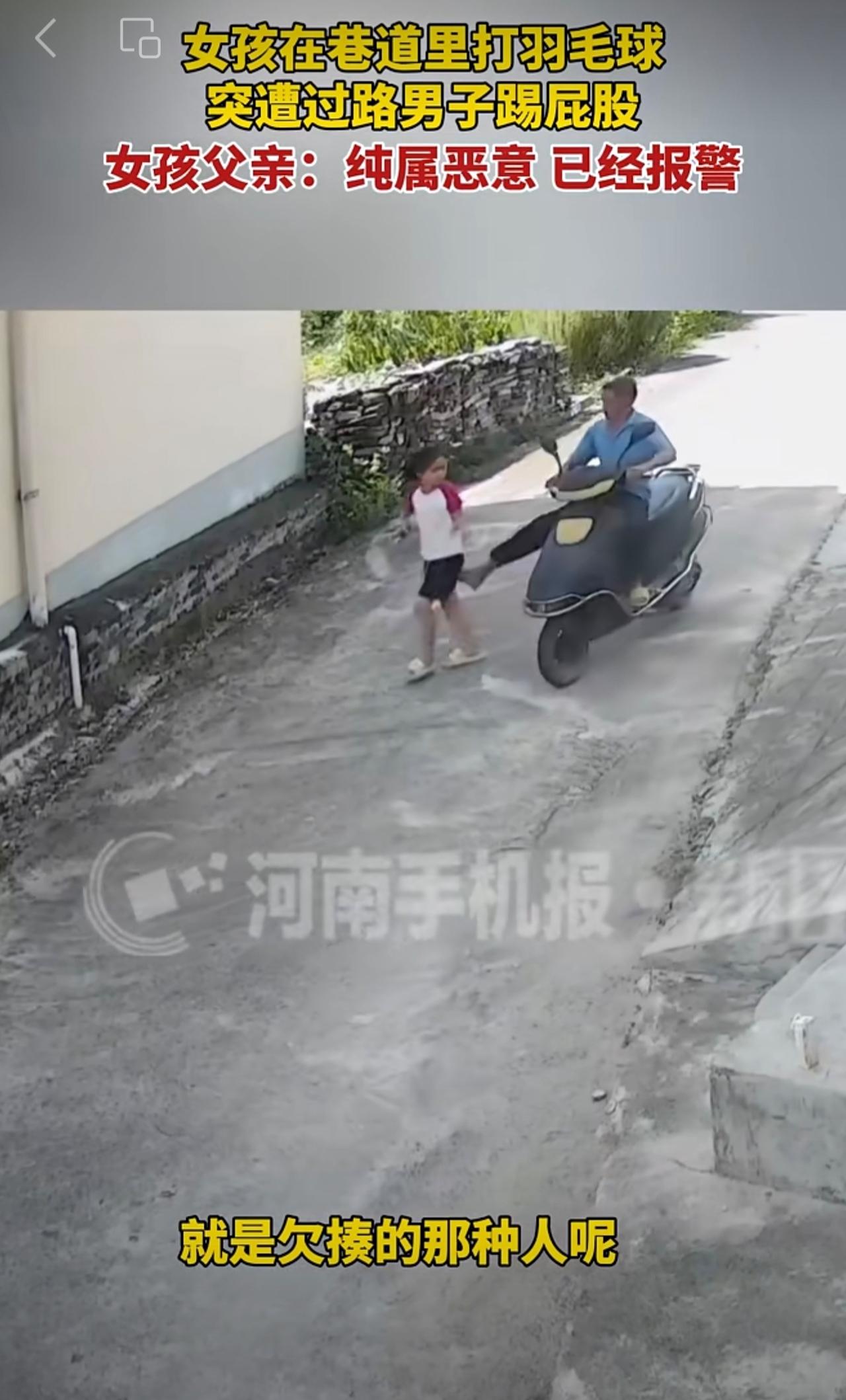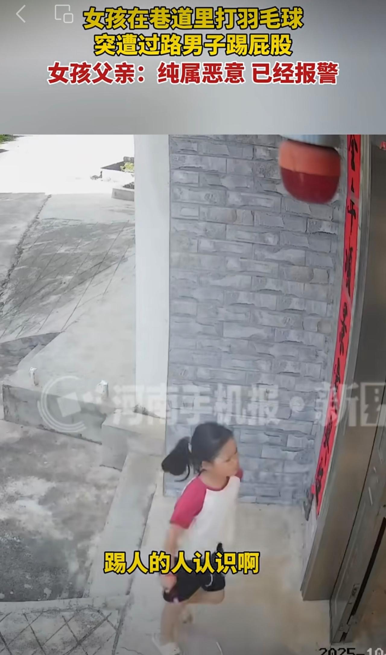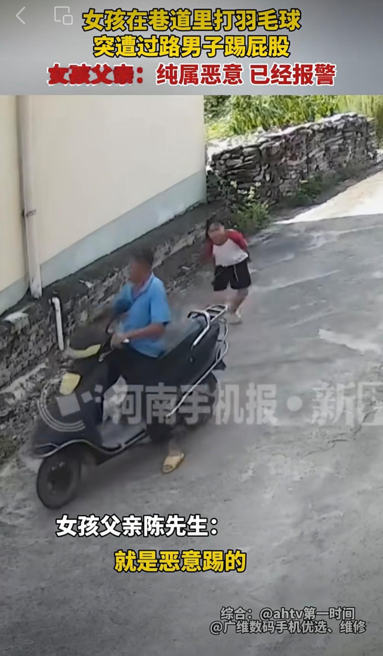 女孩在巷道里打羽毛球,突遭过路男子踢屁股,女孩父亲:“纯属恶意,已经报警。”保护女孩