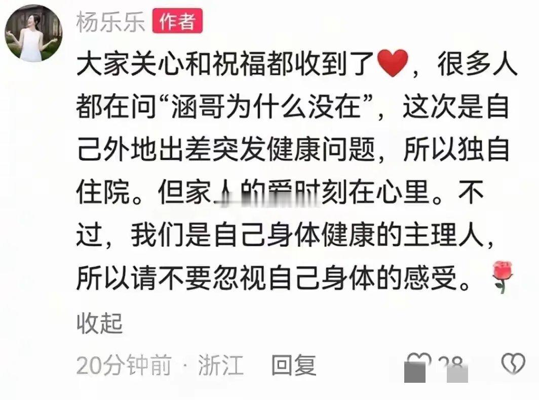 史上最忙的病号应该就是杨乐乐了,感谢大家关心自己身体得同时还得为丈夫汪涵发声:他没有冷漠,只是有工作走不开,当时他就联系当地的朋友来帮我!