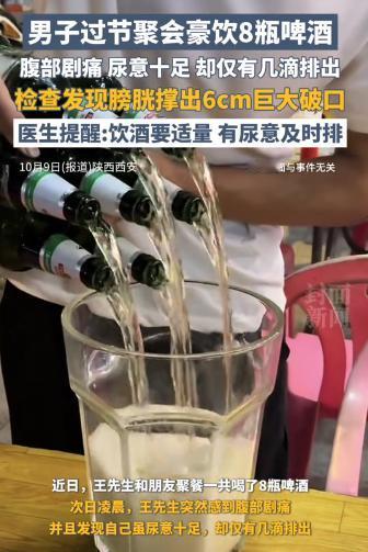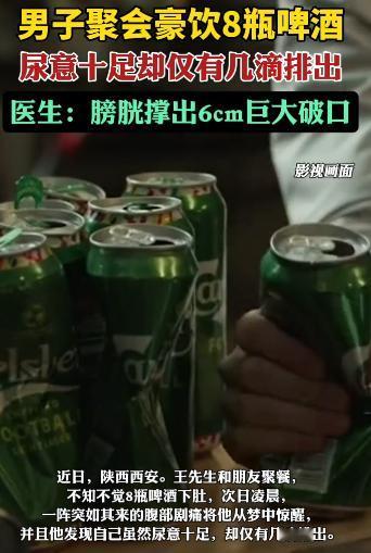 陕西一男子和朋友喝酒,连喝8瓶都没上厕所,回到家发现明明想撒尿却尿不出来了,去医院检查才发现,膀胱已经破了一个6cm的大洞! 国庆假期,一顿热热闹闹的聚餐,8瓶啤酒下肚,本是朋友间的尽兴时刻,陕西西安的王先生怎么也想不到,这会让自己闯一场生死关。 次日凌晨,他被一阵钻心的腹痛疼醒,肚子胀得像个紧绷的皮球,尿意憋得浑身发抖,可蹲在马桶上半天,只有几滴尿液勉强挤出。 家人见状赶紧送他去西安市中医医院急诊,CT片上的结果让所有人倒吸一口凉气。 腹腔里全是不明积液,他的膀胱后顶壁破了个6厘米的大洞,里面的尿液全漏进了肚子里。 好好的膀胱怎么会像吹爆的气球一样裂开? 医生在手术中发现,王先生腹腔里满是淡红色的尿液和炎性渗出物。 还合并了弥漫性腹膜炎和急性肾损伤,光是修补破口就花了整整几个小时。 而这场看似意外的急症,其实是"喝酒"和"憋尿"两个坏习惯联手埋下的祸根。 事情要从聚餐那天说起,王先生和朋友从傍晚喝到深夜,8瓶500毫升的啤酒下肚,期间光顾着聊天拼酒,压根没想起上厕所。 酒精像双重"捣蛋鬼",一边让身体里管排尿的激素"罢工",肾脏就一个劲地产尿,膀胱里的尿量蹭蹭往上涨。 另一边又麻醉了神经,就算膀胱已经装不下了,大脑也收不到"该去厕所"的提醒。 等他回家倒头睡下,膀胱里的尿液早就超过了安全容量。 成年人膀胱正常只能装300到500毫升,可他当时的尿量恐怕快到800毫升了,膀胱壁被撑得薄如蝉翼。 更要命的是,膀胱后顶壁本就是天生的"薄弱区",肌层比其他地方薄,还没什么组织支撑。 就像气球最薄的地方容易破一样,王先生的膀胱在持续高压下,这里率先裂开了6厘米的大口子,比常见的膀胱破裂裂口大了好几倍。 尿液里的尿素、肌酐这些代谢废物漏进腹腔,立刻刺激腹膜引发炎症,这就是他腹痛如刀割的原因。 同时又因为尿液排不出去,肾脏产生的尿液堵在输尿管里,直接伤了肾功能。 更值得警惕的是,这类情况不是个例。 就在今年4月,河南洛阳36岁的陈浩也因为醉酒憋尿出了大事。 他和朋友喝到凌晨,回家冲向厕所时摔了一跤,当即蜷缩在地惨叫,送到北京中医药大学东直门医院洛阳医院检查。 也是膀胱破裂,尿液已经灌满腹腔,好在手术及时才保住命。 而有医生分享过更痛心的案例,有人醉酒膀胱破裂后拖延了6小时才就医。 最后因为感染性休克没救回来,要知道这种并发症的死亡率能达到20%到30%。 哪些人更容易遇到这种危险?泌尿外科医生总结出几类高危人群。 35到50岁的男性是重灾区,2024年有数据显示,这个年龄段的男性单次平均能喝6瓶啤酒,和王先生的量相差不远。 加上不少人有前列腺增生的问题,尿道被压迫导致排尿不畅,膀胱里总留着"残余尿",再喝酒憋尿,破裂风险直接翻倍。 还有膀胱本身有毛病的人,比如得过膀胱炎、有膀胱结石的,膀胱壁早就不结实了,就算尿量没到极限,也可能被撑破。 其实除了这种突然爆发的"急性危机",生活中还有些习惯在慢慢耗损健康,比如长时间刷手机。 可能有人觉得这和膀胱破裂没关系,但它带来的伤害一点也不含糊。 手机蓝光会抑制褪黑素分泌,让人睡不着觉,长期睡眠不足又会拉低免疫力。 低头看手机时,颈椎承受的压力会凭空增加好几公斤,时间长了脖子疼、椎间盘突出都找上门来。 不管是急性的膀胱破裂,还是慢性的刷手机伤害,其实都能预防。 聚餐时别被"不喝就是不给脸"绑架,男性单次喝啤酒别超过1瓶,喝的时候多喝温水促进代谢,每1到2小时主动去趟厕所,哪怕没有尿意也排空一下。 平时刷手机,每20分钟就抬头看看6米外的东西,坚持20秒让眼睛休息,每隔半小时起身伸个懒腰,别让久坐伤了腰和颈椎。 睡前1小时把手机放远,给睡眠留个缓冲期。 王先生的经历给所有人敲了警钟:身体的信号从来不会骗人,膀胱胀了是提醒,眼睛酸了是警告,这些信号容不得忽视。 说到底,健康从来不是"忍忍就过去"的小事。 聚餐时少喝一瓶酒,有尿意别硬扛,刷手机时多起身走走,这些简单的改变,就能守住身体的底线。 信息来源:红星新闻2025-10-08发布:男子豪饮8瓶啤酒,尿意十足却仅有几滴排出,医生:膀胱撑出6cm巨大破口
