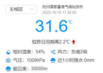 11:30,杭州气温31.6℃,比昨日同期高2.2℃,今日最高气温能不能突破35℃,拭目以待。