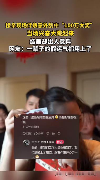 “电视剧都不敢这么演!”近日,一位伴娘在接亲现场玩刮刮乐游戏时,竟然意外刮出了一个“100万元” 的一等奖大奖,伴娘为此激动不已,谁知新娘一句话却让伴娘当场傻眼!网友:这就是人生的大起大落啊。 你敢信?电视剧里的反转名场面,在河北一场婚礼的接亲现场真实上演了!10月7日,河北某地的一处婚房里,红双喜字贴满门窗,喜庆的对联挂满墙面,一场热闹的接亲仪式正在进行。 新郎身着传统中式礼服,带着伴郎团闯关,伴娘们则准备了各种“刁难”环节,其中一个“刮刮乐抽奖”环节,愣是把现场气氛推向高潮,还闹出了个让人忍俊不禁的“大乌龙”。 伴娘小王(化名)自告奋勇拿起一张刮刮乐,她手指紧紧捏住刮刮乐边缘,另一只手拿着刮奖工具,小心翼翼地一点点刮开涂层,周围的人都屏住呼吸,眼睛死死盯着她的动作。 当“100万元”四个大字清晰出现在大家眼前时,小王的眼睛瞬间瞪得像铜铃,嘴巴张得能塞进一个鸡蛋,她激动地跳起来,举着刮刮乐在屋里转圈,大声喊道:“天呐!我中了100万!真的假的!我是不是在做梦!” 新郎和伴郎们也都凑了过来,脸上满是惊讶,有人甚至开始起哄让小王请客。 就在小王沉浸在“一夜暴富”的幻想中,一会儿想着换车,一会儿想着旅游时,旁边的新娘却忍不住捂着嘴笑出了声,她走到小王身边,拍了拍她的肩膀,慢悠悠地说:“我的好姐妹,你别激动了,这是我特意准备的整蛊道具,连我一开始都被这‘大奖’骗到了呢。” 话音刚落,小王脸上的狂喜瞬间凝固,紧接着爆发出一阵大笑,她懊恼地拍了拍自己的额头,现场的所有人也都被这戏剧性的反转逗得前仰后合,原本紧张的接亲环节,因为这个“百万大奖乌龙”变得格外欢乐。 这件事被发布到网上后,很快就吸引了众多网友的关注和评论L: 有网友调侃道:“这大起大落的心情,比看了一集电视剧还刺激,伴娘这波情绪过山车坐得值了!” 还有网友表示:“现在的婚礼整蛊越来越会玩了,这招又新鲜又有趣,就是苦了这位伴娘,白高兴一场但也给婚礼留下了独家记忆。” 甚至有网友开玩笑说:“这伴娘是懂怎么制造惊喜(惊吓)的,不过有这一出,估计这婚礼能让她记一辈子。” 其实,透过这件事,我们也能看出不少门道,如今的年轻人办婚礼,不再局限于传统的流程,而是喜欢加入各种新奇、有趣的环节,像这种“刮刮乐整蛊”,既增添了接亲的趣味性,让现场热闹非凡,又不会让参与者感到尴尬或不适,算是一种很有创意的新玩法。 同时,生活中也常有这样的“意外惊喜”,有时候看似天上掉馅饼,结果却是一场美丽的误会,但正是这些小插曲,让我们的生活多了许多欢笑和值得回味的瞬间。 那么你们怎么看待这件事呢?欢迎在评论区说说你们的看法吧!