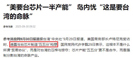 面对美国要抢走台湾一半芯片产业的勒索,赵少康向大陆发出质问:“你们为什么不出来讲话,说只要台湾不独立就不打他?” 美国对台湾芯片产业的觊觎,早就是摆在台面上的心思,毕竟台湾握着全球科技产业链的“命门”——台积电一家就包揽了全球95%的高端芯片生产,2024年数据显示它的3nm制程出货占比26%,5nm占34%,7nm及更先进制程加起来占了总营收的74%,苹果的A系列芯片、英伟达的AI加速器全得靠它代工。对美国来说,要保住科技霸权,就必须把这块“肥肉”攥在自己手里,所谓的“供应链安全”不过是抢东西的幌子。 最先动手的是政策捆绑,2022年美国出台《芯片与科学法案》,揣着527亿美元补贴当诱饵,明着是鼓励企业赴美建厂,实则藏着苛刻的“护栏条款”——拿了补贴的企业10年内不能在中国大陆扩产先进制程,连产能提升都卡着10%的上限。 这招精准掐住了台积电的命脉,毕竟它的大客户里美国企业占了半壁江山,根本不敢硬刚。于是从2020年开始,台积电被迫启动赴美建厂计划,投资从最初的120亿美元一路加码到650亿,后来甚至被特朗普喊出要追加到3000亿美元,成了美国史上最大的外方直接投资项目。 可这建厂之路压根不是合作,更像是“渡劫”:原本宣称2024年底投产的亚利桑那第一厂,硬生生拖到2025年上半年还没产出一颗芯片,第二厂更是直接延后两年,连跟着去的供货商都只能把3亿美元的工厂停摆,活生生被拖进泥潭。 更狠的是成本转嫁,美国本土的劳动力成本比台湾高30%,工会罢工说停就停,单厂日耗水量堪比10万户家庭,这些额外开支最后全算在了台积电头上。 AMD都公开说了,亚利桑那厂的芯片比台湾本土贵5%到20%,4nm工艺溢价甚至能到30%。台积电没办法,只能把成本转嫁给终端,2026年起5nm以下先进节点要涨价5-10%,2nm晶圆直接飙到3万美元以上,等于美国抢完产能还要让全球消费者买单。 而那些所谓的补贴,比起不断追加的投资不过是杯水车薪,英特尔拿的补贴零头都比台积电多,说白了台积电就是在“赔钱赚吆喝”,还得把自家核心产能拱手送人。 联电的遭遇更能看出美国的霸道,这家台湾第二大芯片企业早前和福建晋华合作开发DRAM技术,结果被美国司法部盯上,扣上“窃取商业机密”的帽子。 最终联电被迫认罪,交了6000万美元罚款,还得协助美国调查晋华,而晋华直接被列入实体清单,上百台设备成了摆设,53亿美元的投资打了水漂。 这哪是司法追责,分明是杀鸡儆猴,警告所有台湾芯片企业:敢和大陆合作,就是这个下场。自此之后,台湾企业对大陆的先进制程出口彻底受限,南京的台积电工厂想扩产7nm都没资格,只能眼睁睁看着大陆市场被别人抢走。 等台积电、联电被拿捏得差不多了,美国就彻底撕下了伪装。2025年9月,美国商务部长卢特尼克直接抛出“五五分”方案,公开要求台湾把一半芯片产能搬到美国,还美其名曰“互惠合作”。紧接着财政部长贝森特也跟风造势,说台湾产高端芯片是“全球最大单一风险”,必须把30%到50%的产能转移到美国或盟友那里。 这话说得冠冕堂皇,可明眼人都看得出来,美国就是想掏空台湾的“硅盾”——要知道2024年台湾半导体出口占GDP比重超40%,30万工程师靠着这个产业吃饭,一旦一半产能外移,物流成本要涨20%,人才会跟着流失,从材料到封装的完整产业链也会被拆得七零八落。 台积电高管心里门儿清,先进制程依赖本土的精密生态,美厂良率才70%,比台湾本土的85%差远了,可在美国的压力下,也只能硬着头皮说美厂是“备份”,实则眼睁睁看着核心技术外流。 台湾当局的反应更是耐人寻味,面对美国的公开勒索,“行政院”只敢说“不予评论”“审慎以对”,连句硬气的话都不敢讲。国民党立委许宇甄看得透彻,直言这根本不是合作,是“强制分割台湾的命脉产业”,把台湾的安全筹码全弄没了。 可再不满也没用,美国早就布好了局:要么乖乖把产能搬过去,要么就等着被加征300%的关税,连苹果、英伟达这些客户都被美国逼着锁定美厂20%的产能,台湾企业根本没有退路。 就是在这样的背景下,赵少康才会发出那样的质问。毕竟美国的掠夺已经从暗箱操作变成了明抢,从施压设厂到索要一半产能,步步紧逼,而台湾芯片产业这条经济命脉被越攥越紧,随时可能被连根拔走。 在这种实实在在的危机面前,难免会有人想问,面对这样的勒索,能有人出来说句硬话,能有个明确的态度,给台湾留一点底气和空间。