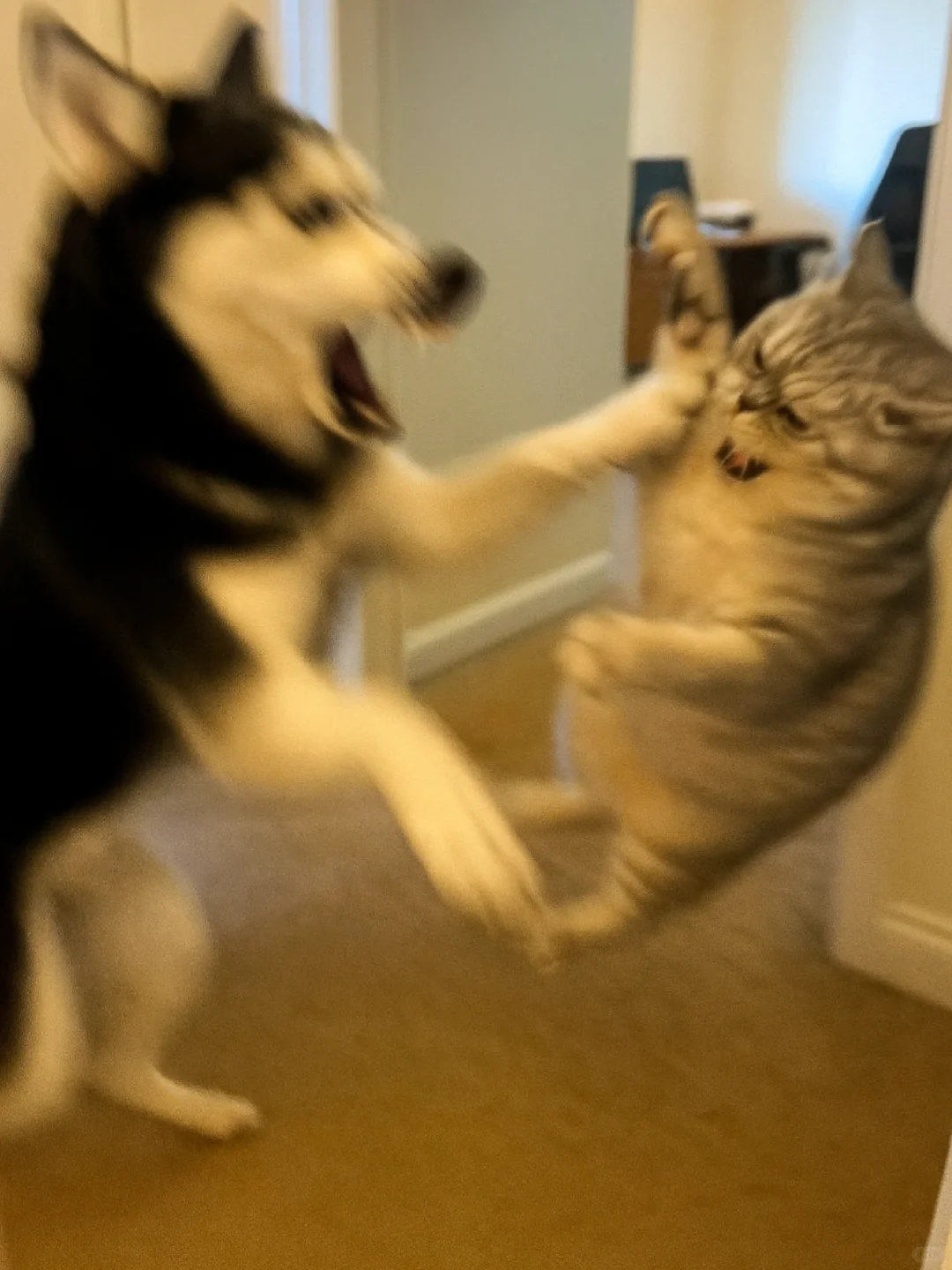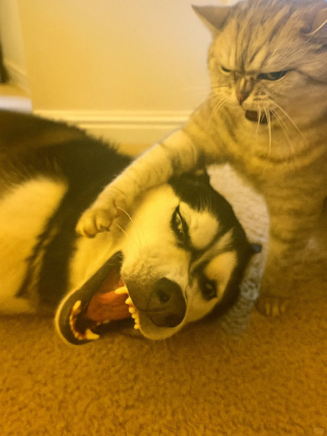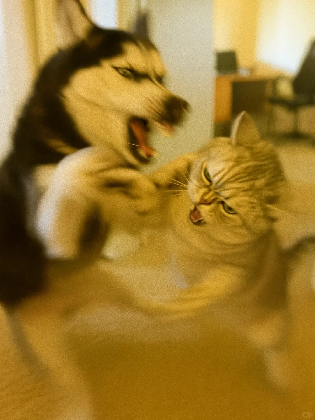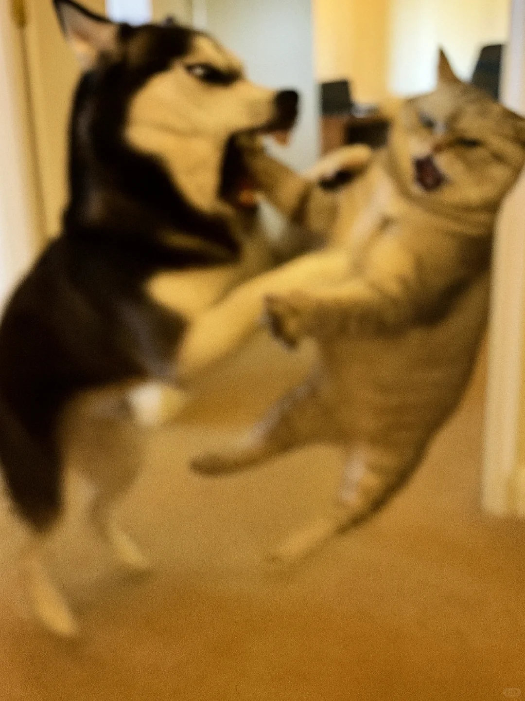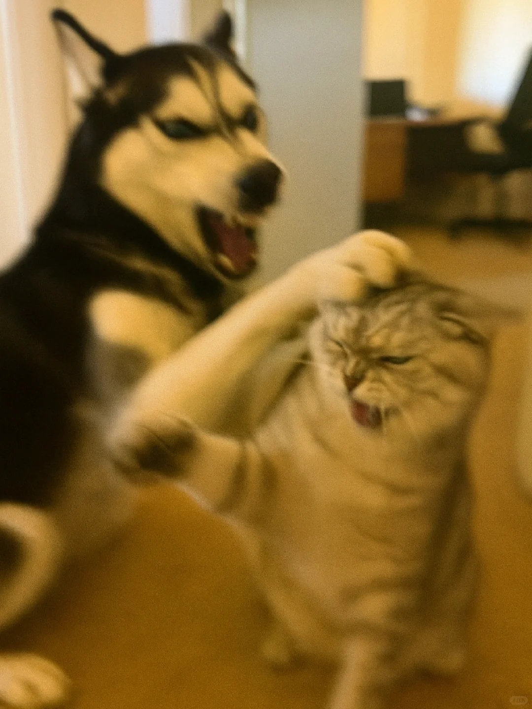 家人们谁懂啊!哈士奇和银渐层打起来啦![哭笑] 这俩活宝追着满屋跑,爪子挥得比谁都带劲~ 姨姨们快来看热闹,需要情头的速来截,主页还有橘猫、蓝白等打架名场面!你觉得谁会赢? ​​​