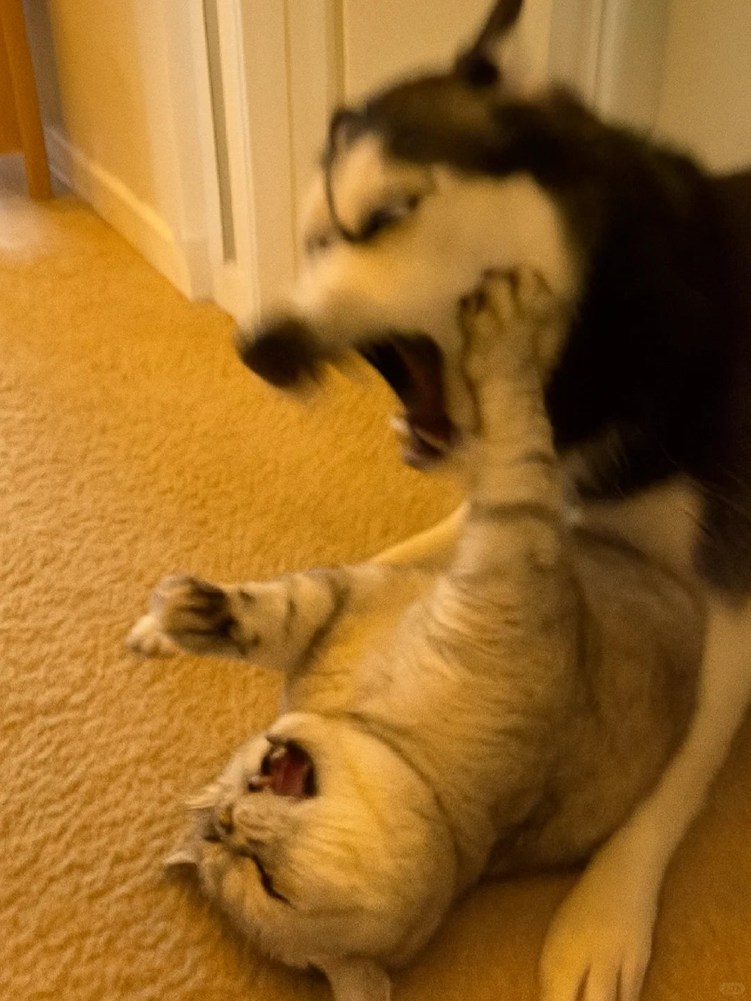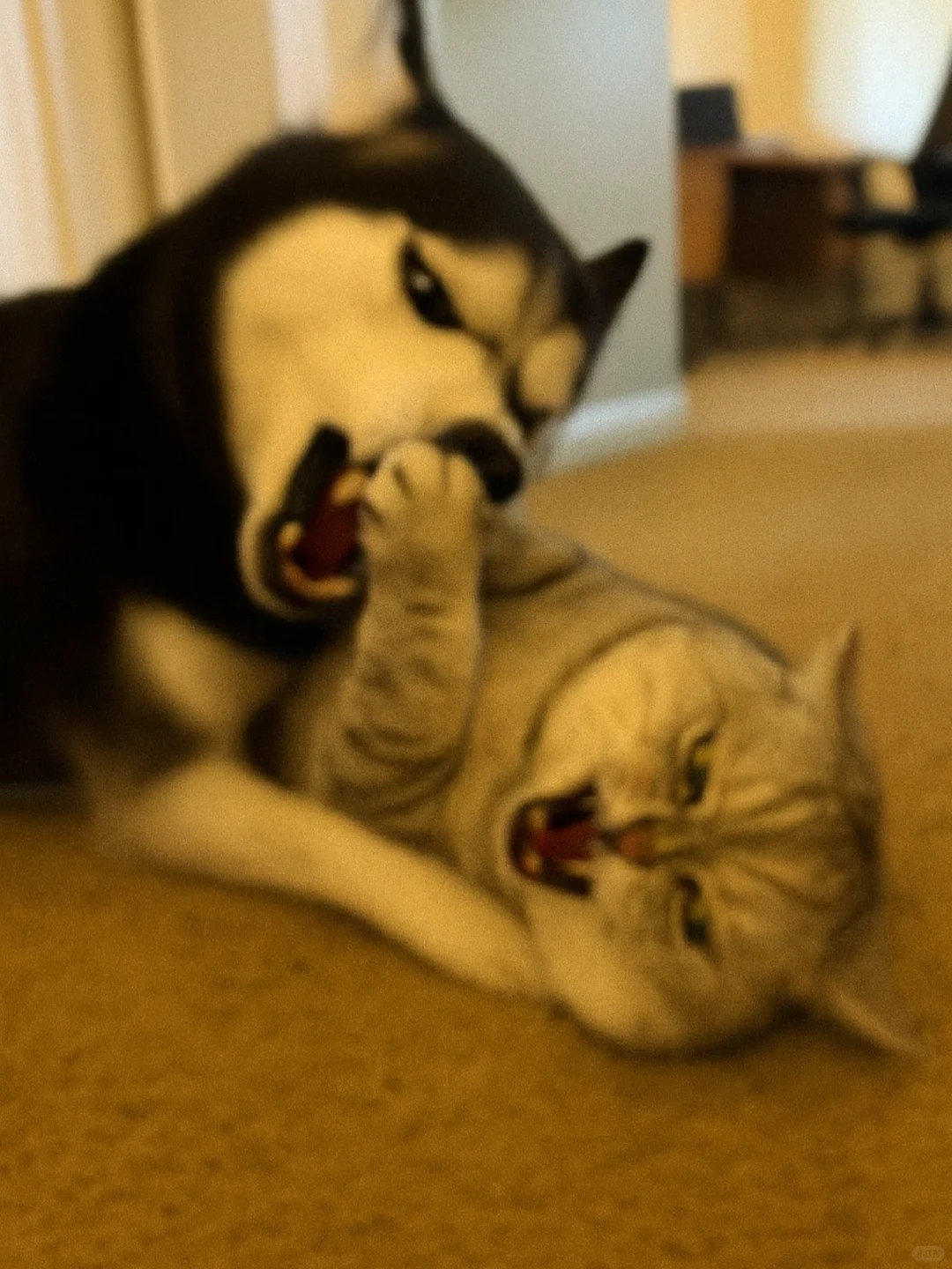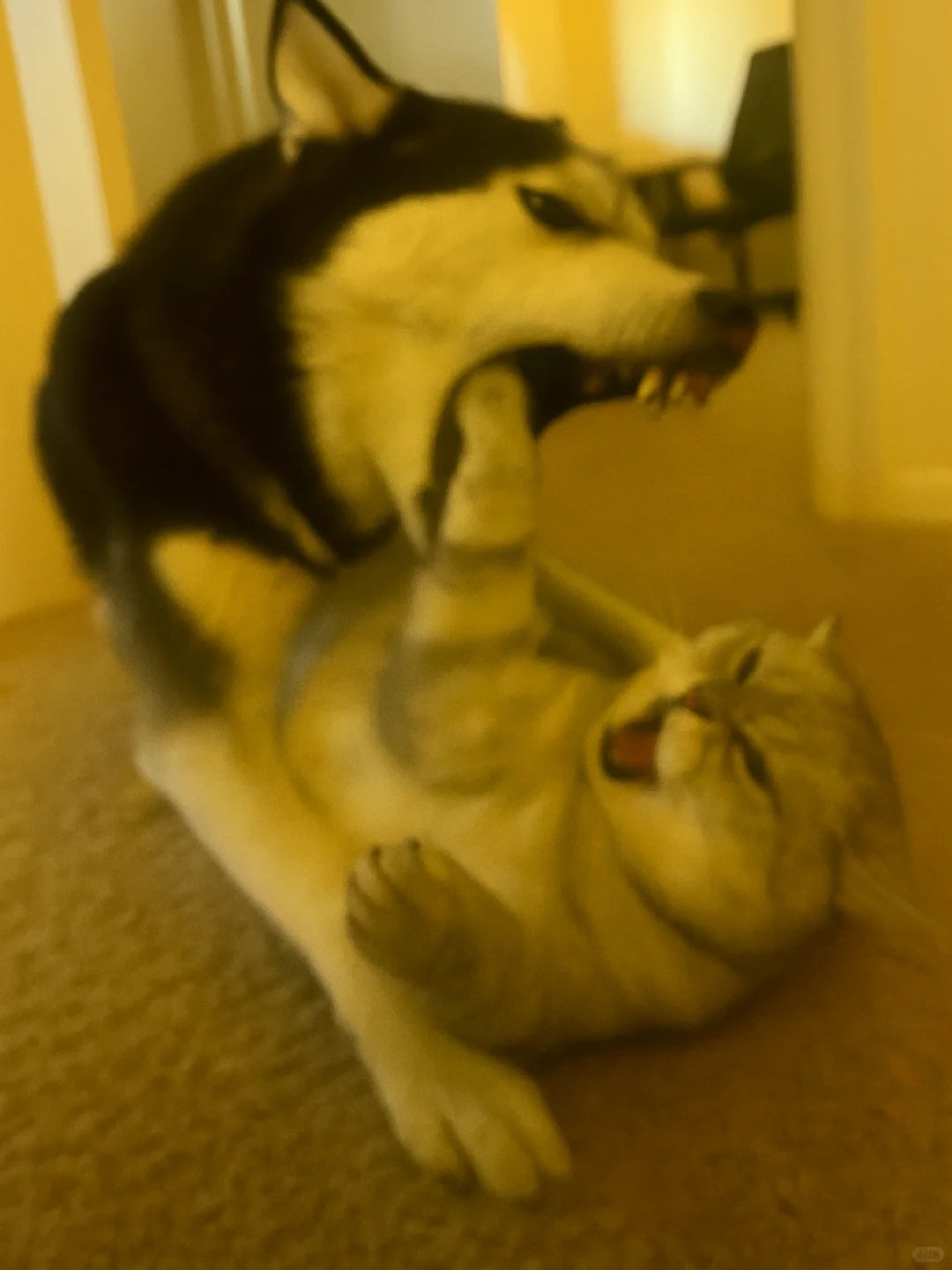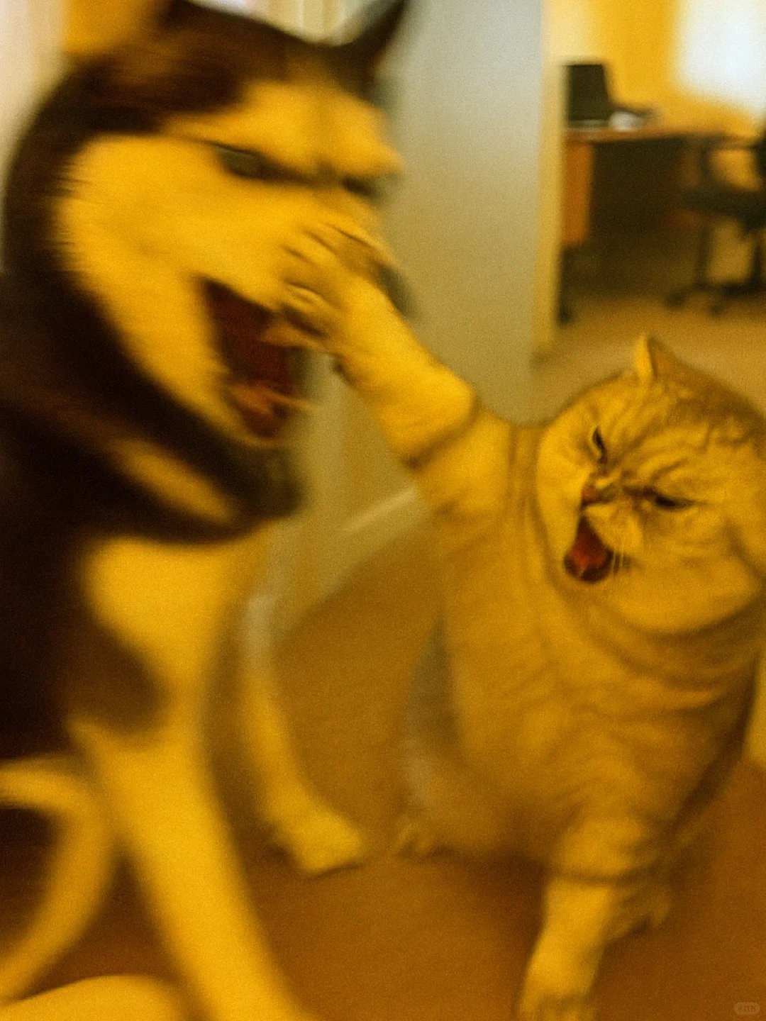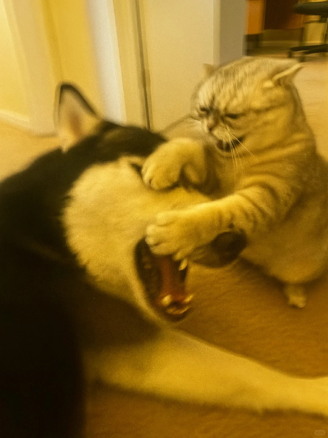 家人们谁懂啊!哈士奇和银渐层打起来啦![哭笑] 这俩活宝追着满屋跑,爪子挥得比谁都带劲~ 姨姨们快来看热闹,需要情头的速来截,主页还有橘猫、蓝白等打架名场面!你觉得谁会赢? ​​​