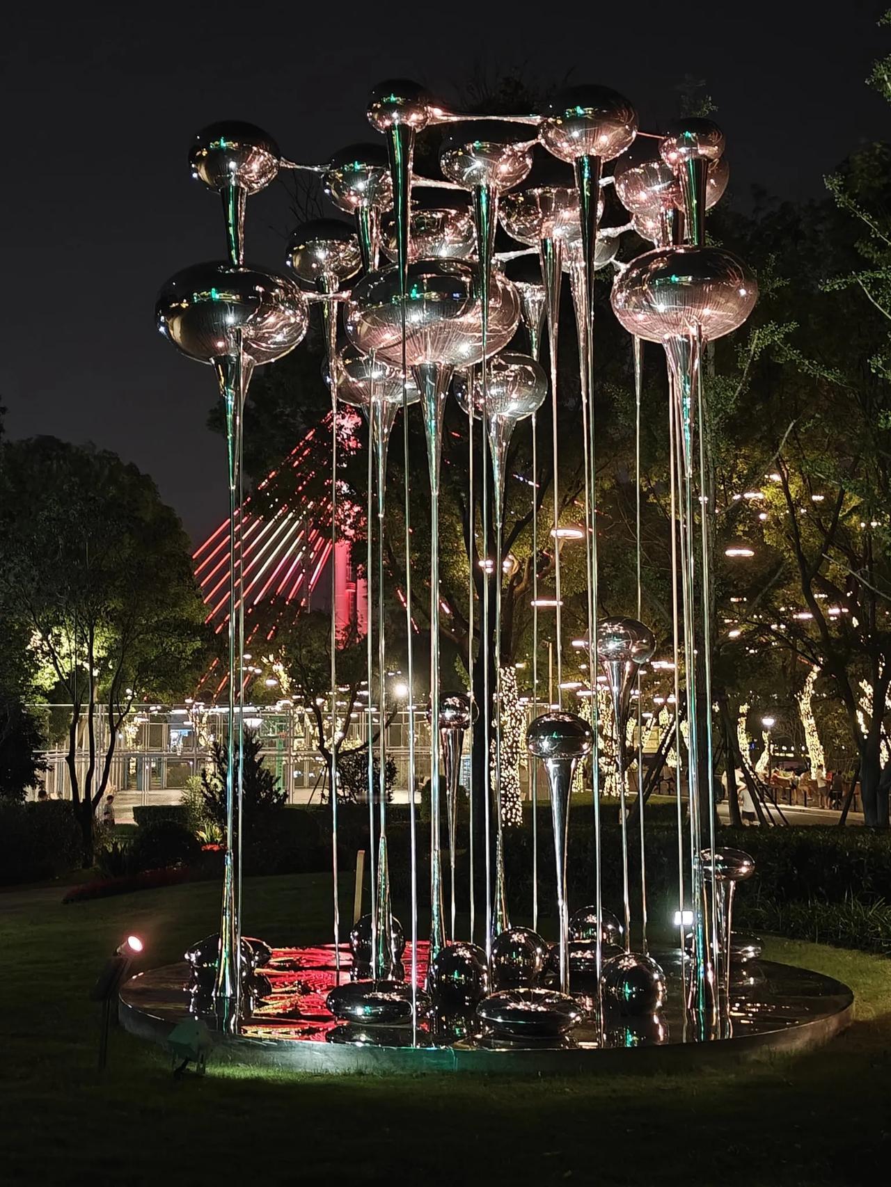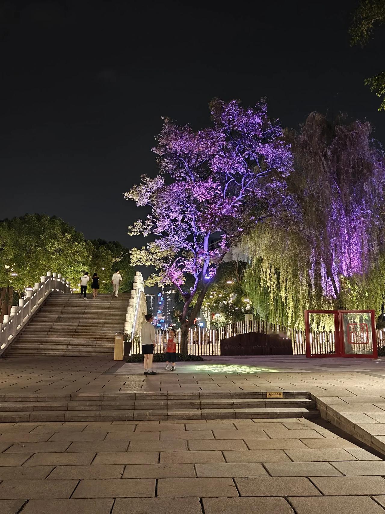 🌃夜晚的公园太会玩浪漫了!草丛里“飞”着发光的蝴蝶,金属艺术装置在灯光下像未来秘境,还有树木被染成梦幻紫,连石桥都变得诗意满满。散步的人们或驻足拍照,或悠闲漫步,在光影交织中,把平凡的夜晚过成了童话。这样的夜公园,谁能不爱?城市夜景 公园打卡
