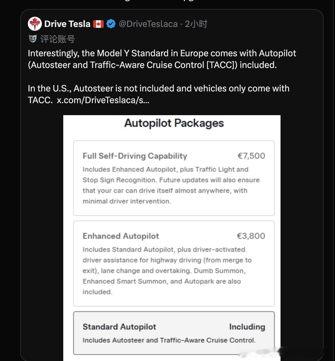 而欧洲标配AP是因为FSD还没在欧洲每个国家地区完全铺开