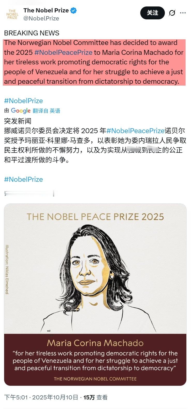 2025年10月10日,诺贝尔和平奖正式揭晓,挪威诺贝尔委员会决定将其授予玛丽亚·科琳娜·马查多,以表彰她为促进委内瑞拉人民的民主权利所做的不懈努力,以及她为实现从所谓“独裁”政权向所谓“民主”制度的公正且和平过渡所做的斗争。